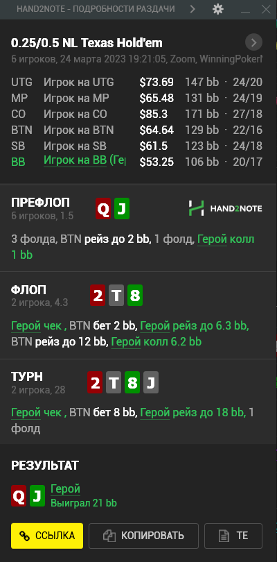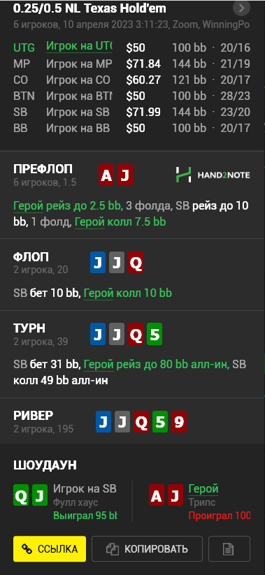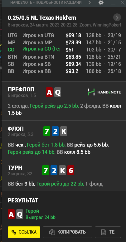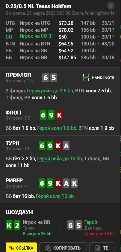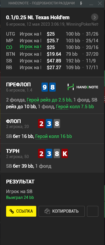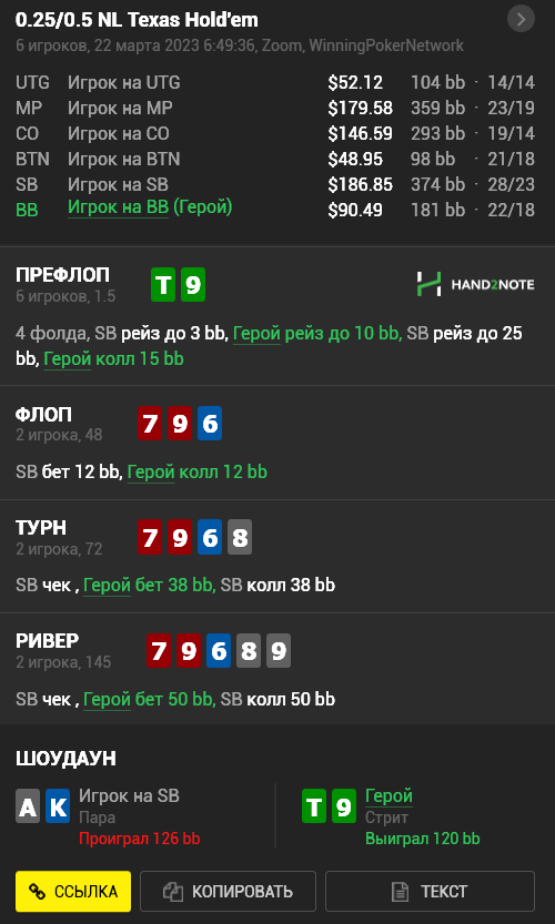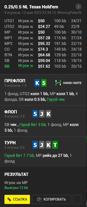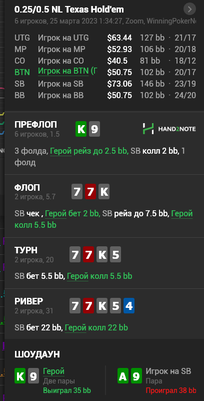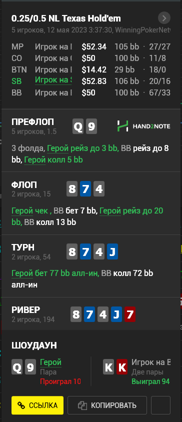 >>51113 77) Как мне подсказывает опыт, 9x на флопе очень редко рейзят, как и Ax. Во всяком случае на NL100 редстара. Есть конечно, но очень редко. Я бы давал сильное смещение в сторону блефов, бэкдоров и немного 5x, ну и натсы, конечно. И по тёрну дрова тоже редко в чек переводят, так что 76 и JT там вообще быть не должно на ривере. Просто вопрос чего там больше, сдач с мусором или хироколлов по Qx... От оппа зависит уже и поляны, мне кажется у нас часто бы можно было увидеть колл с Qx. AQs) Я таких помечаю, как агро-фиш, есть ещё нитовый фиш и просто дефолтный фиш. >В рейзе флопа могут быть карманки ниже 9х, 9х из рук лучше Это по нотсам? Я очень редко от фишей вижу защиту рейзом с чем-то хуже ТП (ещё на спаренном флопе карманки могут быть). Скорее поверю в рандомный мусор против твоих 1/3 на дровяной доске. Если так, то донк имеет смысл, просто чтобы горы мусора выбить и не дать себя выблефовать. Тогда согласен с раздачей, как сыграно, но! Колл флопа для меня всё ещё сомнителен, уж слишком часто выйдет плохой тёрн и нам придётся сдаваться. Или ты заранее планировал очень часто донкать? Как вообще эта линия у тебя против фишей? Часто юзаешь? >>51114 Не было такого бага у меня, хотя я иногда так и делаю, сначала пикча, потом пишу долго. Но вообще, я всегда, по привычке, сохраняю в буфер текст, прежде, чем отправлять длиннопосты.