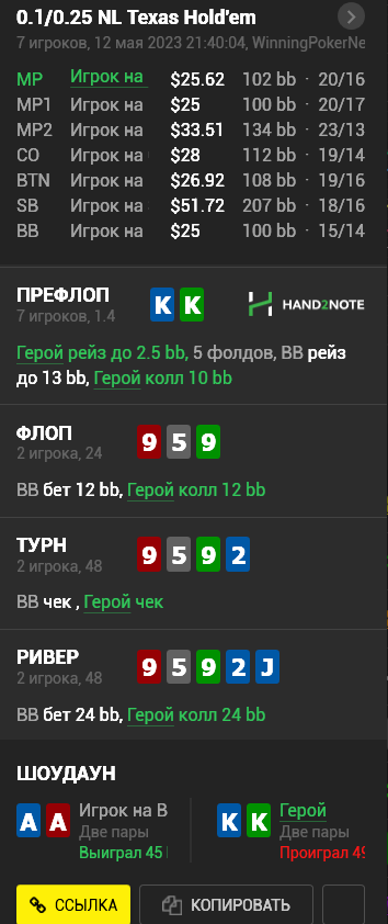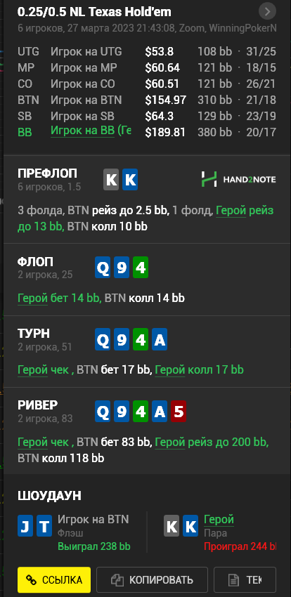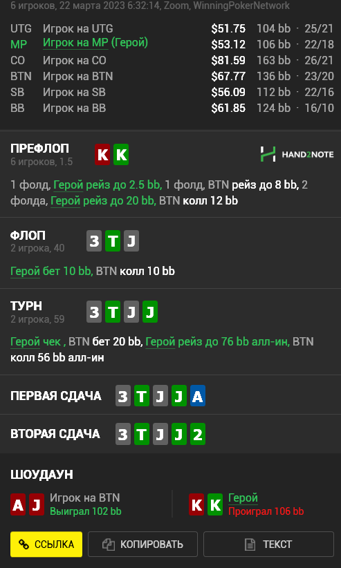 По кассе +356. За прошлые дни, начиная с 10 мая занимался теорией 8 часов. Думаю записать сессию, обсудить с тренером и пойти наконец разъебывать говнарей на нл100. Как никак зум50 за плечами. https://www.youtube.com/watch?v=LmsuxO5rfEU >>51037 с 44 однозначно ошибка. Я это написал в посте. С K5o я еще с чико не люблю таких нитовых фишей, играя с которыми ты плюсуешь чисто за счет красной. С ними даже труднее чем с регами, из-за их мании слоплеить все и вся, а когда рейз - туши свет. С KK тот диап, который ты ему накидал префлоп в целом такой же и на постфлопе остается(AK, QQ-AA). Вообще думаю твой вариант с пушем как раз лучше, потому что нитяра где-то лишний раз недоблефует с АК, где-то не вельюбетнет дамы, а тузы ему сыграть безошибочно не сложно. Просто бля, на 9макс столах такие и дамы коллить могут вс ЕП, что даже и не будет ошибкой в гто страте.