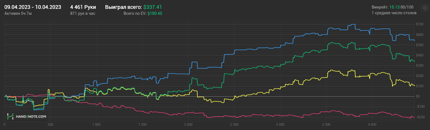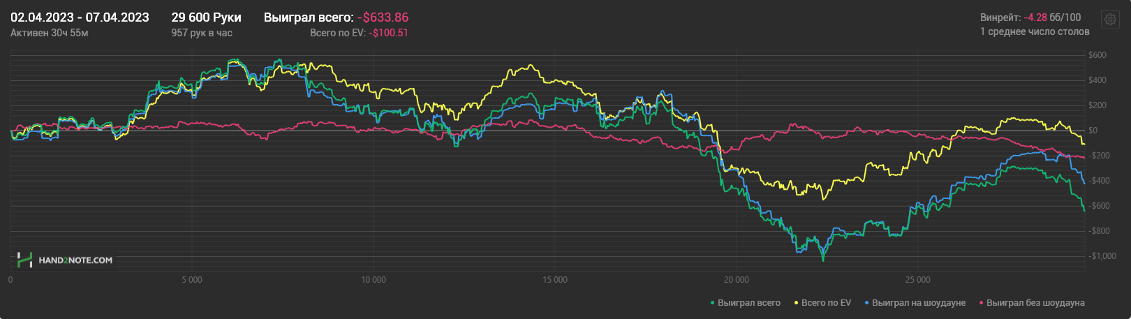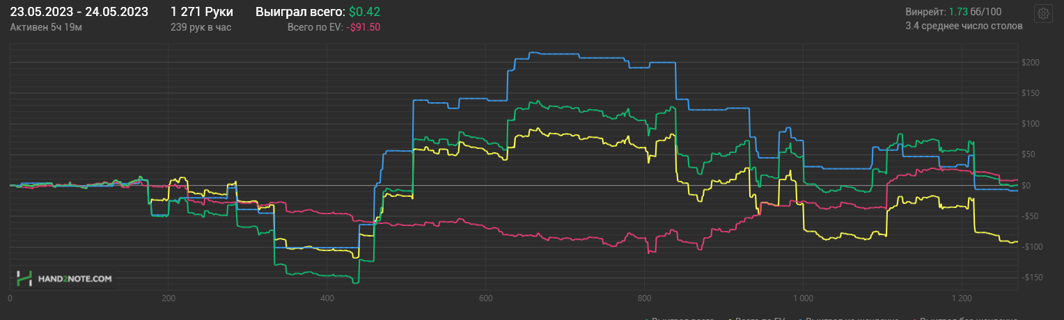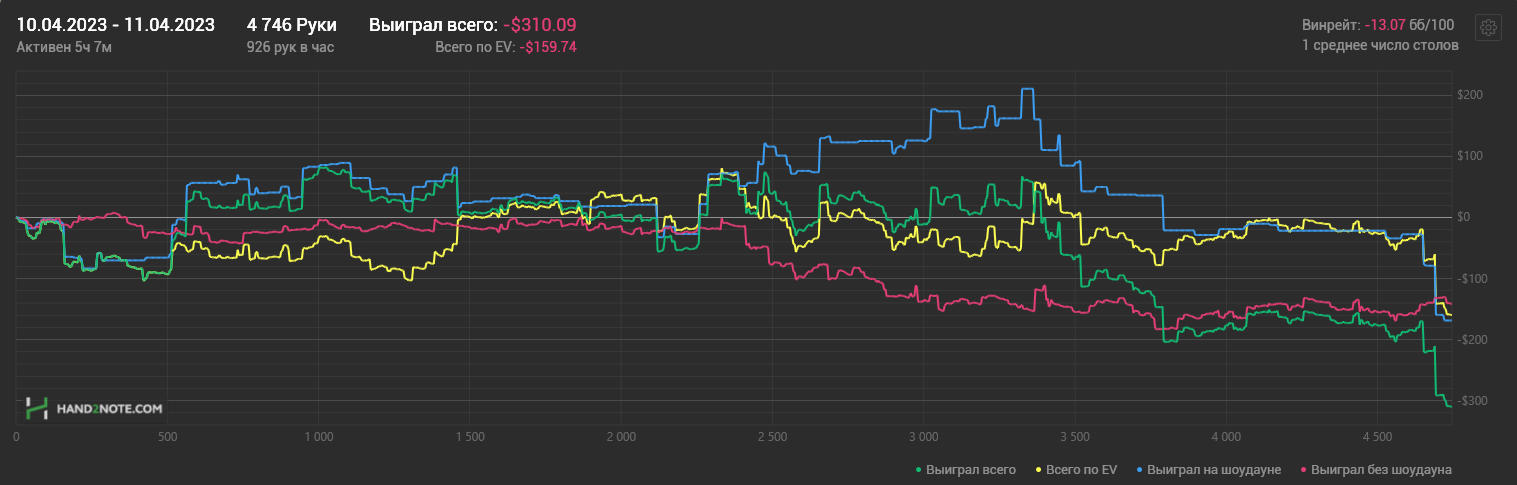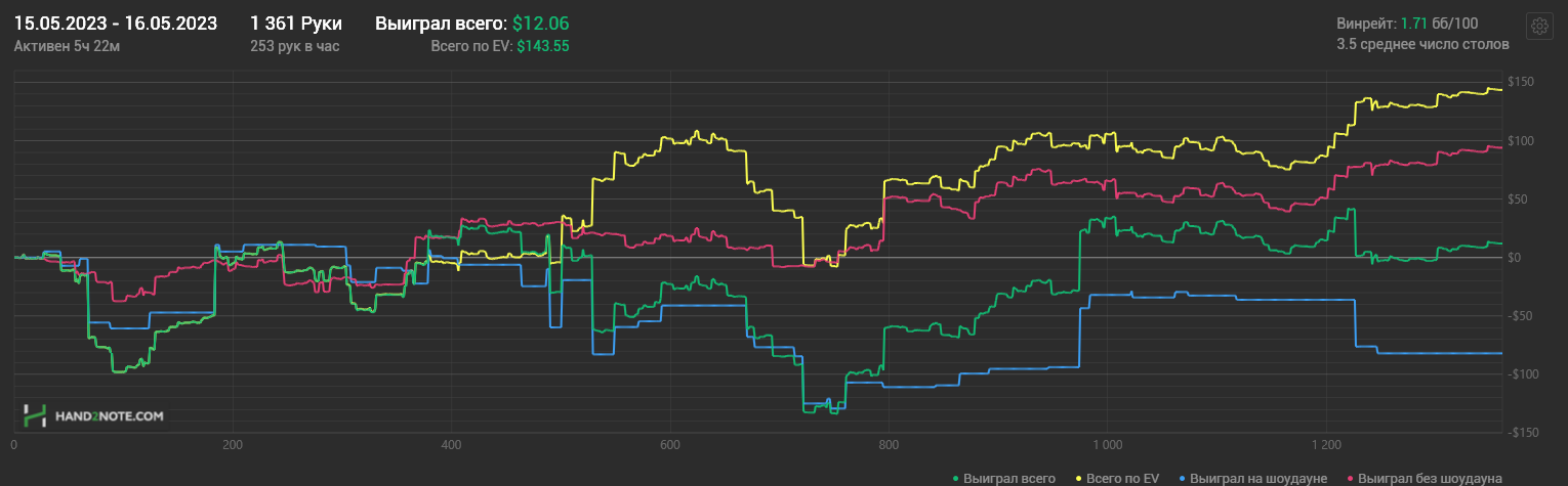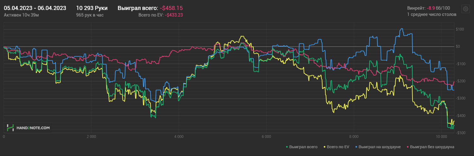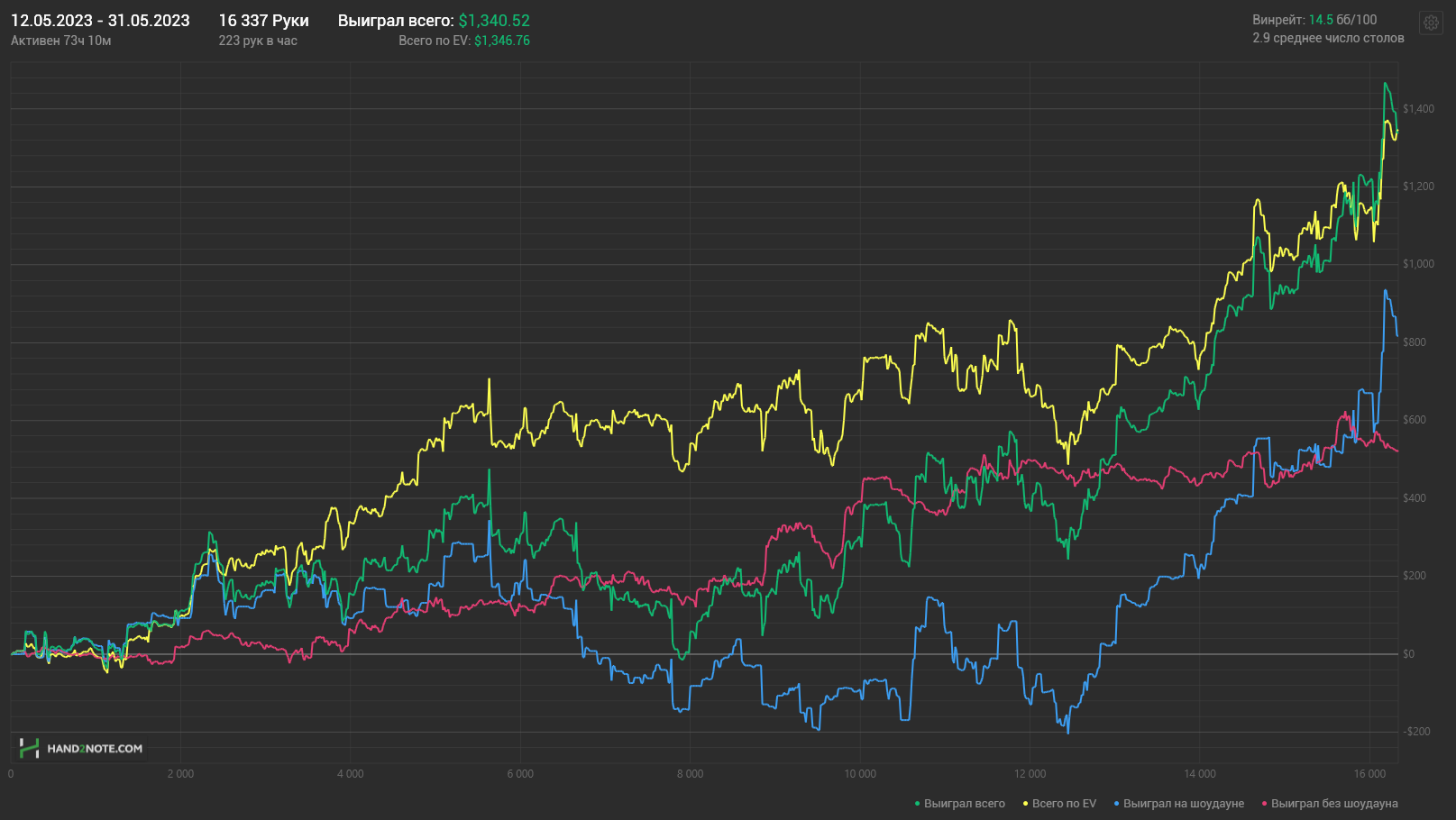 Эх, в первые дни месяца я был в стадии максимального выгорания с удивительной дикой природы в зуме и не притрагивался ни к теории, ни к столам. Затем числа с 10, стало интересно просто раздачки поразбирать чужие, и вот так, постепенно разгоняясь, я набрал к сегодняшнему дню чемпионскую дистанцию в 16к рук!