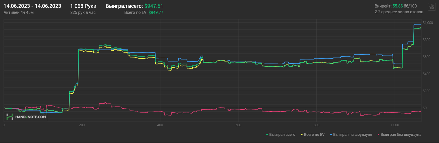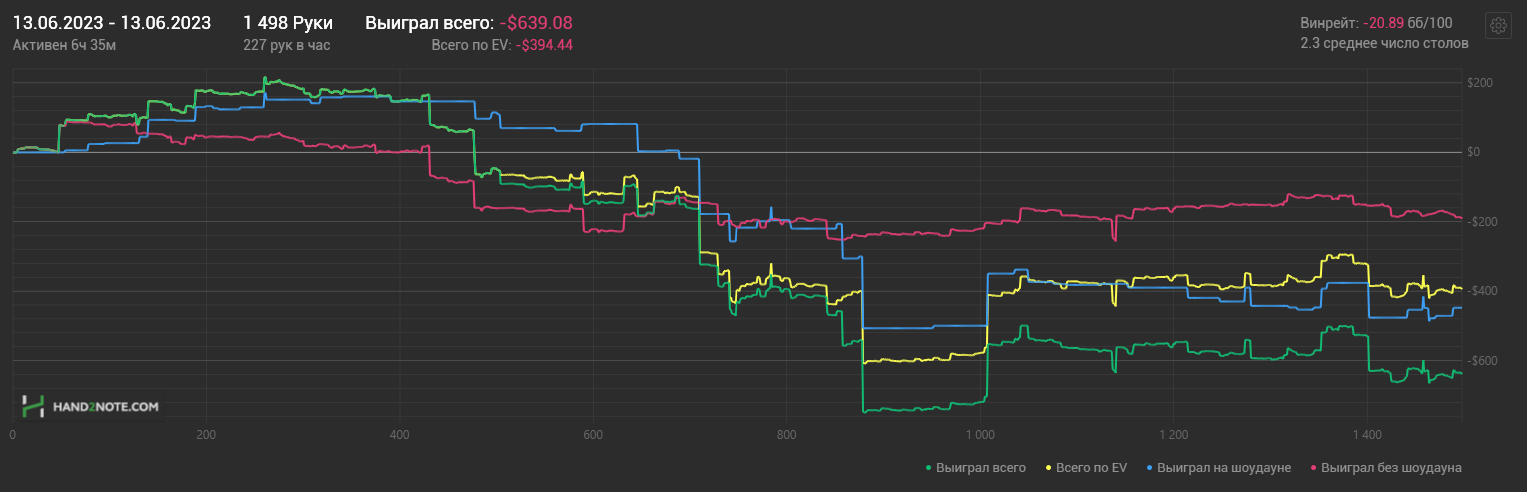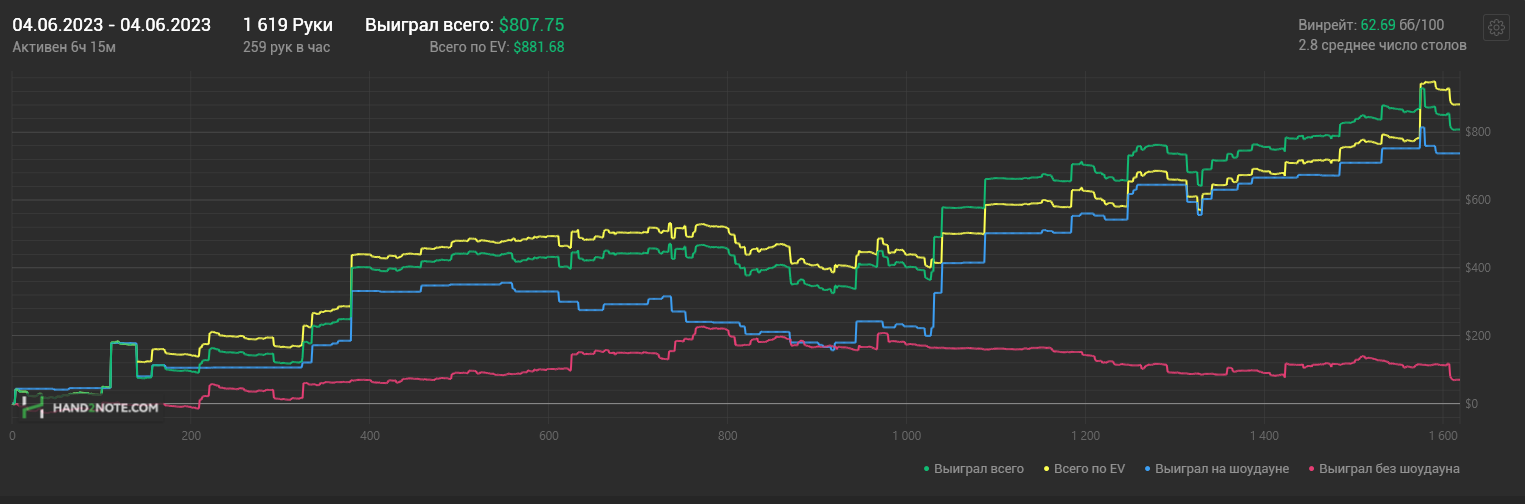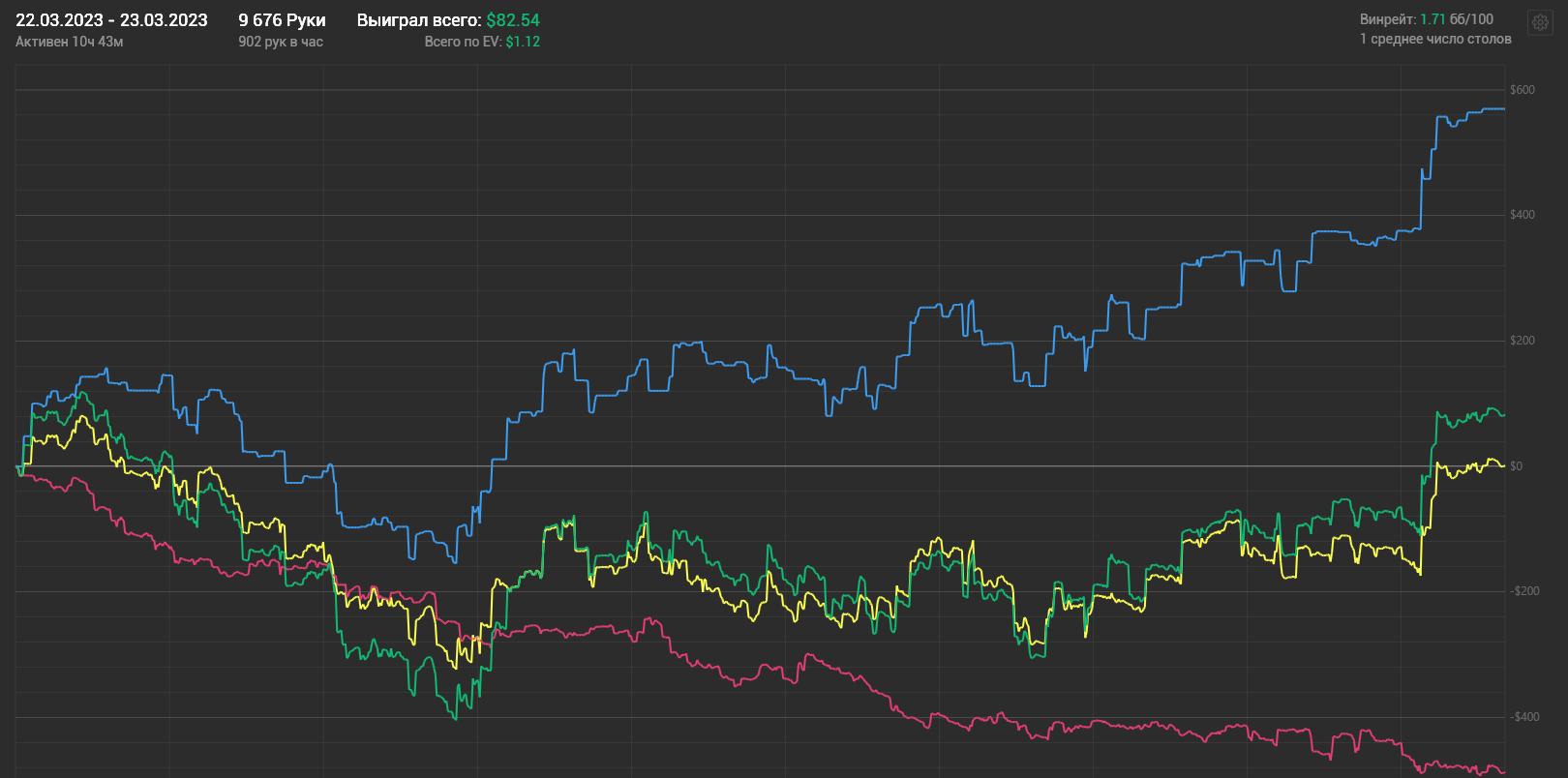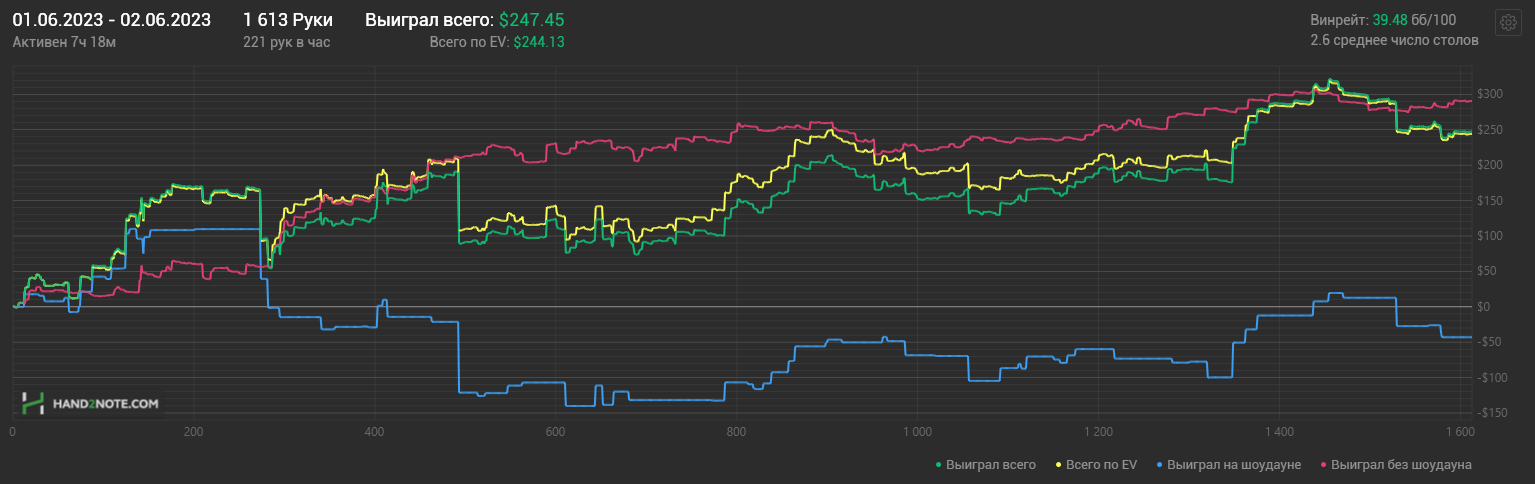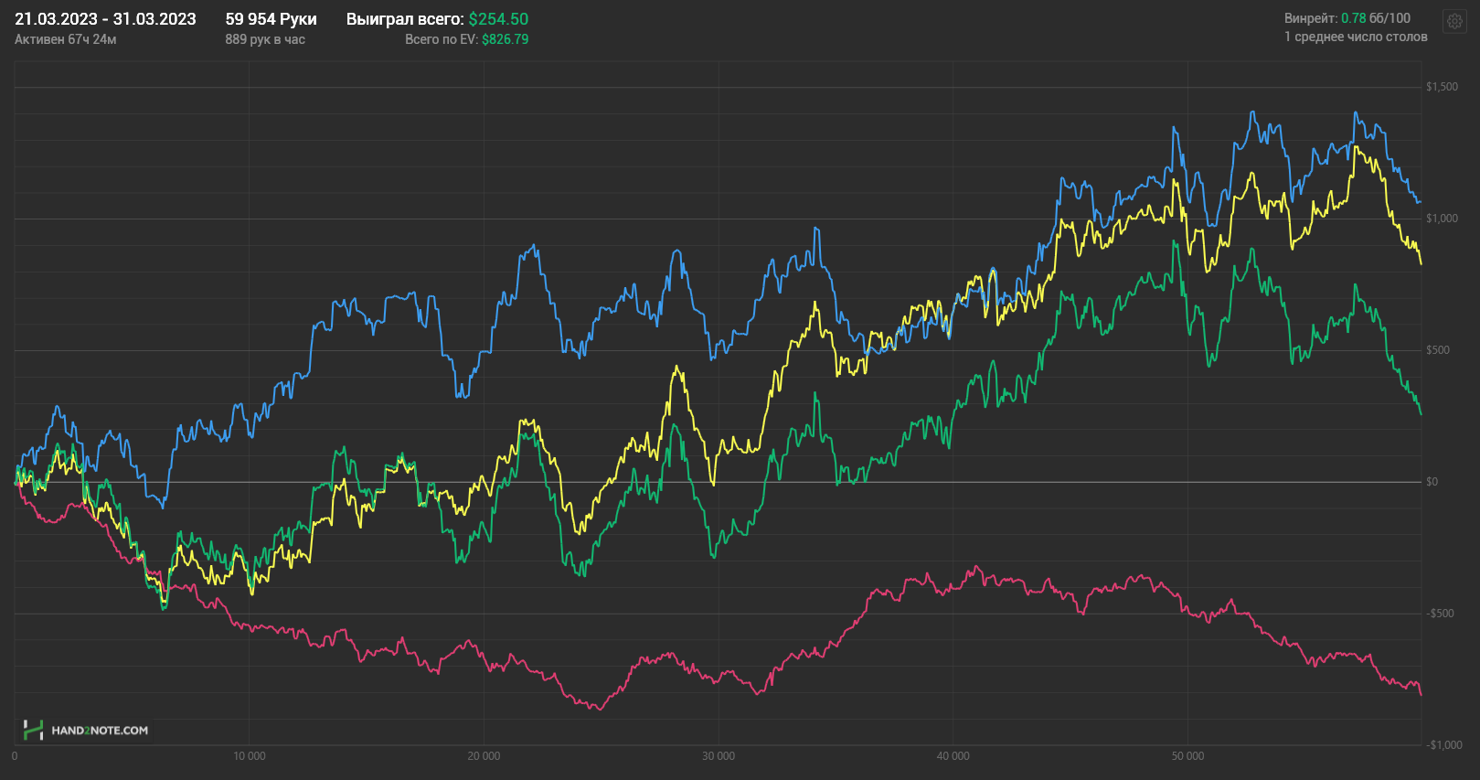 Эх, в первые дни месяца я был в стадии максимального выгорания с удивительной дикой природы в зуме и не притрагивался ни к теории, ни к столам. Затем числа с 10, стало интересно просто раздачки поразбирать чужие, и вот так, постепенно разгоняясь, я набрал к сегодняшнему дню чемпионскую дистанцию в 16к рук!
