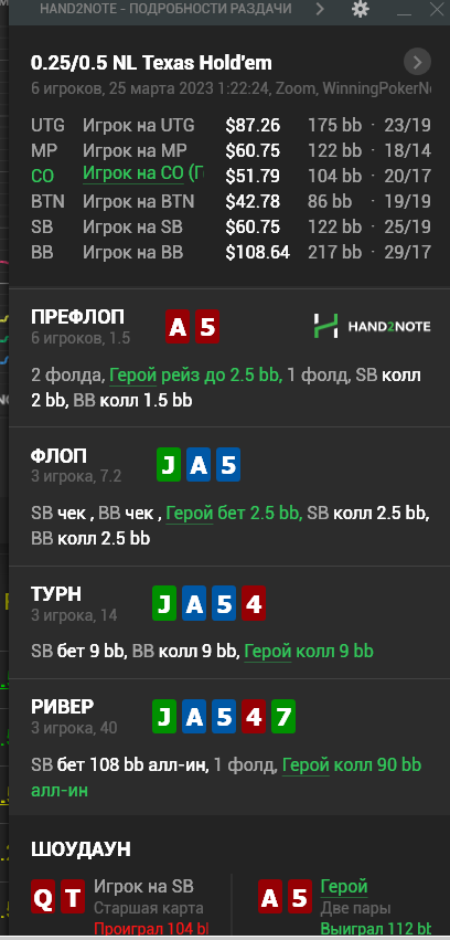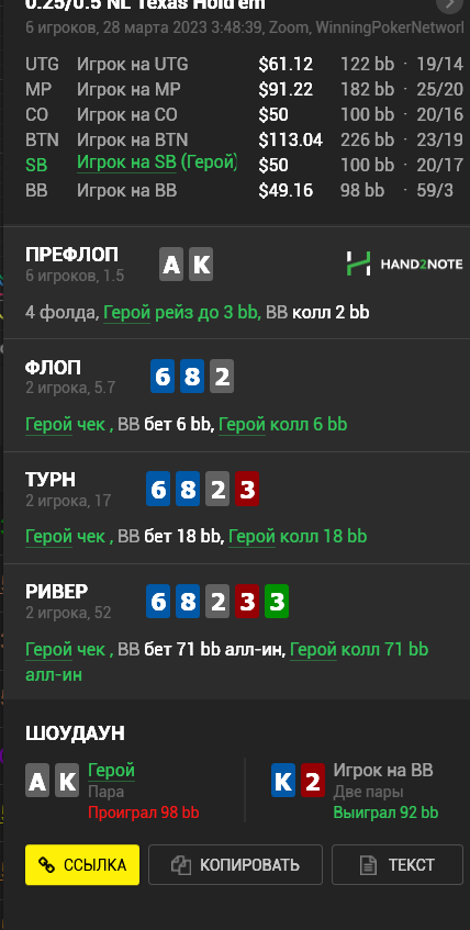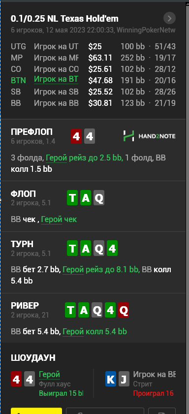 >>51108 77) Интересная раздачка. Флоп и тёрн в принципе дефолт. А на ривере, мне интересно, что ты хотел выбить своей ставкой? И что ты ему в рейз даёшь? Так то его рейз не много смысла имеет, да и в целом ему тут не обязательно иметь рендж рейза, разве что пуша... AQs) Я вообще HU не очень понимаю, но мне кажется ты тут что-то исполняешь уже. У тебя рендж бет тут что ли? Просто по логике, тут чек должен быть очень широкий и эта рука, явно в чеке. И на рейз она явно не защищается, потому что при 100% рендже у тебя куча рук лучше. Но опять таки, у него сайзинг рейза корявый, что может быть делает колл около нуля, но сомнительно. И донк мне вообще не понятен. Десятка и флаш помогают вам обоим, особенно с его мелким рейзом, который должен много мерж-ТП содержать. Ты по-сути выбиваешь все его блефы, которые и так сдаются и даёшь дешево протащить все остальное. Какой план на ривер был в случае колла? Просто в моих глазах это выглядело бы, как JJ+ без пики и пушнул бы в тебя все дро тут. Но я теперь понимаю, почему у тебя красная такая. :3 >Все скидываются по 4(9макс)-5(шмакс)бб и ловят рандомную руку с рандомным флопом. Т.е. на SH внезапно следующей рукой пот 30bb и все с рандомной рукой смотрят на флоп? А блины куда деваются? Где баттон? Но в целом, я думаю, что с ТП можно спокойно играть бет флопа, пуш-тёрна. В таких широких диапазонах любое попадание уже сильно, а ТП так вообще. И в любой закрывшийся стрит или флаш, я думаю, можно блефовать с блокером, потому что такие комбинации редко собираются, но в таких широких диапазонах все поверят. Хотя, конечно, нужно считать. В любом случае, это лютая пиханина при 100bb стеках. Обман чтобы набрать классырейк.