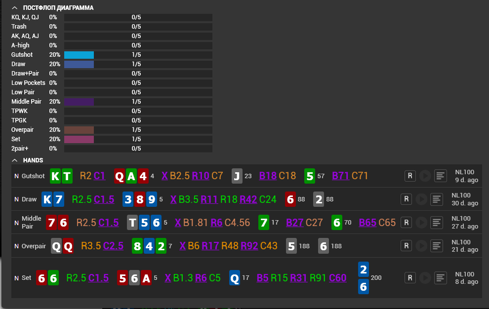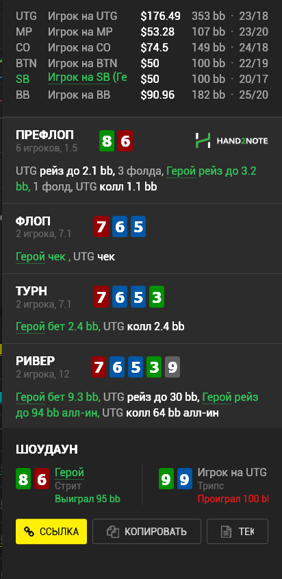 >>51035 Ебал рот двач. Сидел 20 минут пост писал, он продолжает бесконечно отправлять их сюда. Перескажу описание раздач коротко. 1. Обычный фиш 45 15. Против таких уверенный бет ривера. 2. Обычный рег. По комбам вышло, что комб флешей и стрита больше, чем фулов старше и они при этом готовы бет-коллить = рейз. 3. Странный фиш-нит. Не уверен, что такие оплатят мой доезд в фулл, заколлив донк-пуш ривера, а некоторые из рук сильнее еще и кулерят по доезду. 4. Возможно выборка мала, но показалось, что это прям жесткий нит+BBvsALL у него 3бет 0 был. Префлоп-флоп исходя из этого норм, терн можно ставить 33-50 для облегчения ветки ривера. В случае чека терна, колл ривера близок к обязательному, 6 комб AA, 6 комб QQ, немного АК, очень-очень редко AJ.