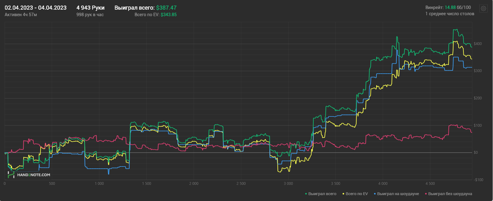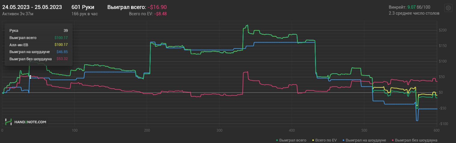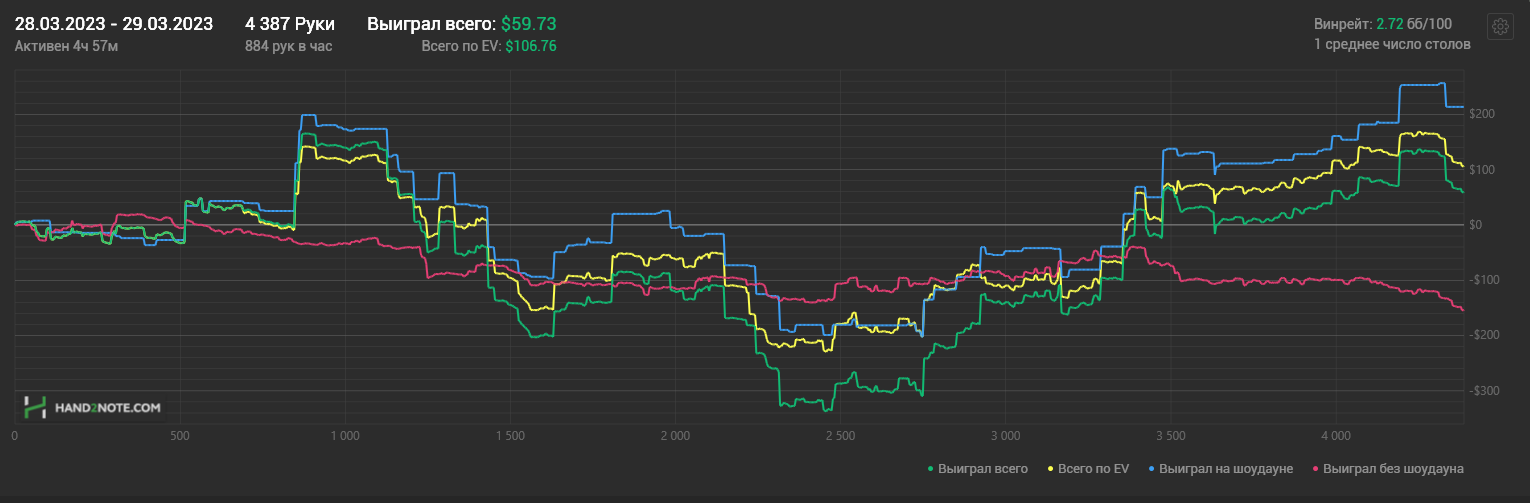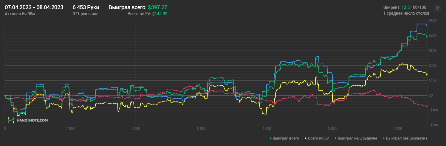 >>51273 В посте где-то было спам-слово и поэтому так.. Вчера не играл, сегодня опять поздновато проснулся, из-за чего получилось мемное количество рук в час и в целом. Сегодня твердо и четко лягу таким образом, чтоб встать не позднее 4-5 мск. Из плюсов сессии - общий шот нл200 идет пока в 0, хотя всегда есть шанс, что это лишь насыпка перед вылетом...