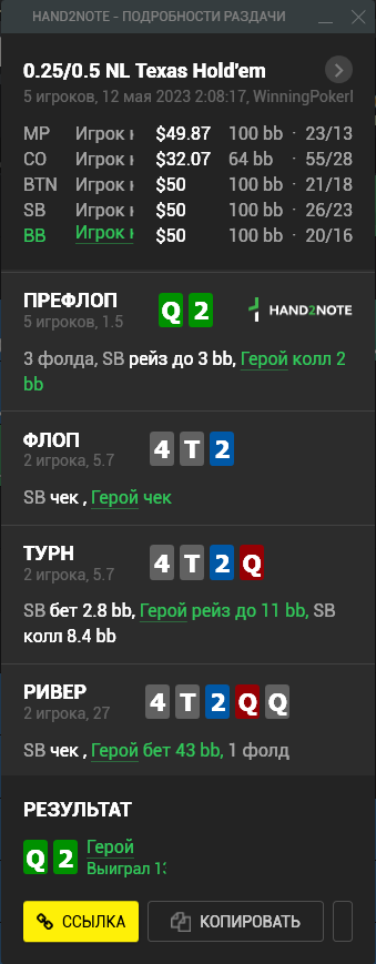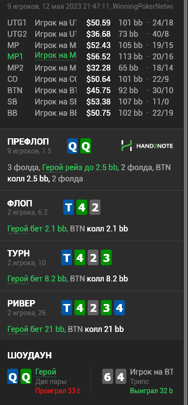 >>51031 1) Так это разве не фиш? 8bb рестил и статы пока странные... Если так, то 99 там и не будет; у среднего фиша 3бет 2-4%, же. Тогда тут ты выбиваешь весь мусор на флопе и он уже ничего почти не выкинет на тёрне. Я бы склонялся к фолду префлоп, если честно, предполагая, что это фиш с нитовым 3бетом. А если защищаться, то на постфлопе играл бы пассивно, фиши не склонны баррелить на блефах, так что там недоблеф и проще по-шансам играть с дро. Если это рег, то в принципе, как угодно можно играть в зависимости от поляны или стат, но против 1/2 я бы тут склонялся к коллу с таким средним ФД и прицелом на чек/пуши(или донк, если ты юзаешь) подходящих тёрнов. Если рейзить, то я бы выбрал сайз поменьше, до 17bb где-то, тогда можно второй баррель ставить и пушить 50bb ривером, чтобы давить на его средние руки и шире такое проворачивать. Овербет-пуш уж как-то слишком полярно. 2) 11/9 это реальные статы? Фолд префлоп тогда. Да и вообще 98 так себе, учитывая, что TJQ дают AK кулер против нас. Я эту руку вообще убрал, где можно из коллов 3бетов. Как сыграно, всё от стат зависит. Такой крупный сайз флопа(80%) обычно не играют, похоже опять на какого-то фиша-нита, который так или с AA исполняет или с рандомом, типа AK. Флоп уже около нуля, как по мне, а тёрн я за фолд. Алсо, если это норм рег, велью там может быть не мало, потому что у нас Kx нет тут, кроме может быть парочки AK и KQs, если ты их тянешь вообще. Так что там изи JJ+ будут и все его блефы с KTs, KJo и прочее. Хотя опять же, NL25... 3) Да, сайзинг его особого смысла не имеет, как по мне. Но скорее всего, это именно то сколько он ставит - средняя рука, которая не хочет чекать и потом попадать в непонятную ситуацию на твои беты. Так что я бы дал Tx и немного рук сильнее, которые тонко добрать хотят. Исходя из этого, на ривере у него почти никогда нет трипса или руки сильнее. И баланс нам соблюдать против такого не нужно, так что ставим столько, сколько Tx заплатит, изображая промазавшие стрит-дро. 33-75% норм. Но в теории я тоже за овербет, если там сбалансированный второй баррель.
