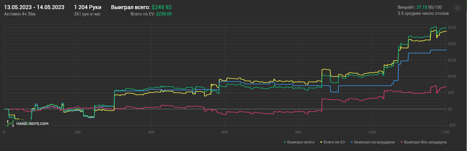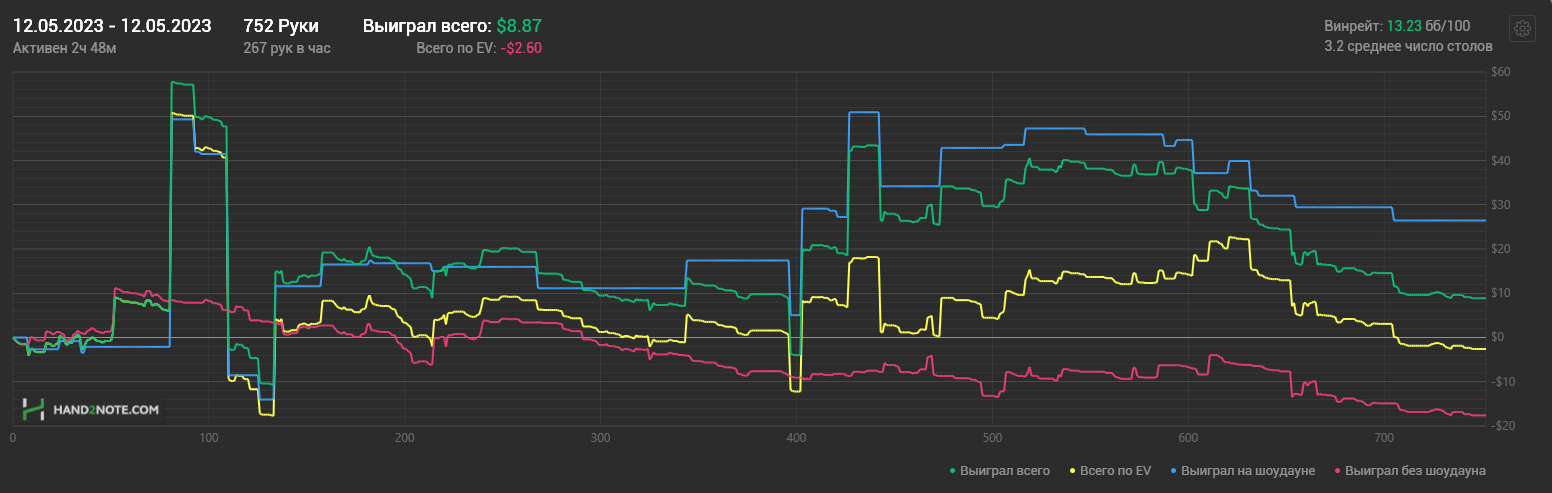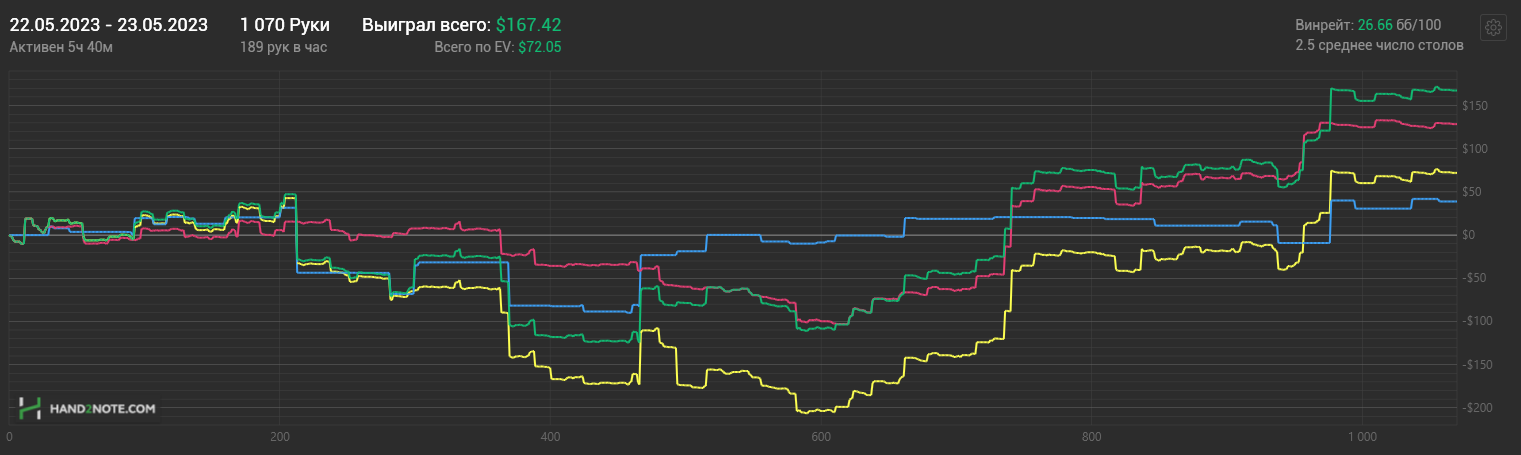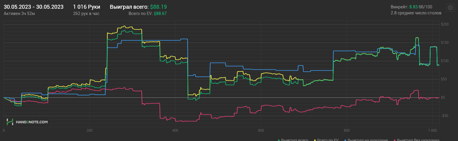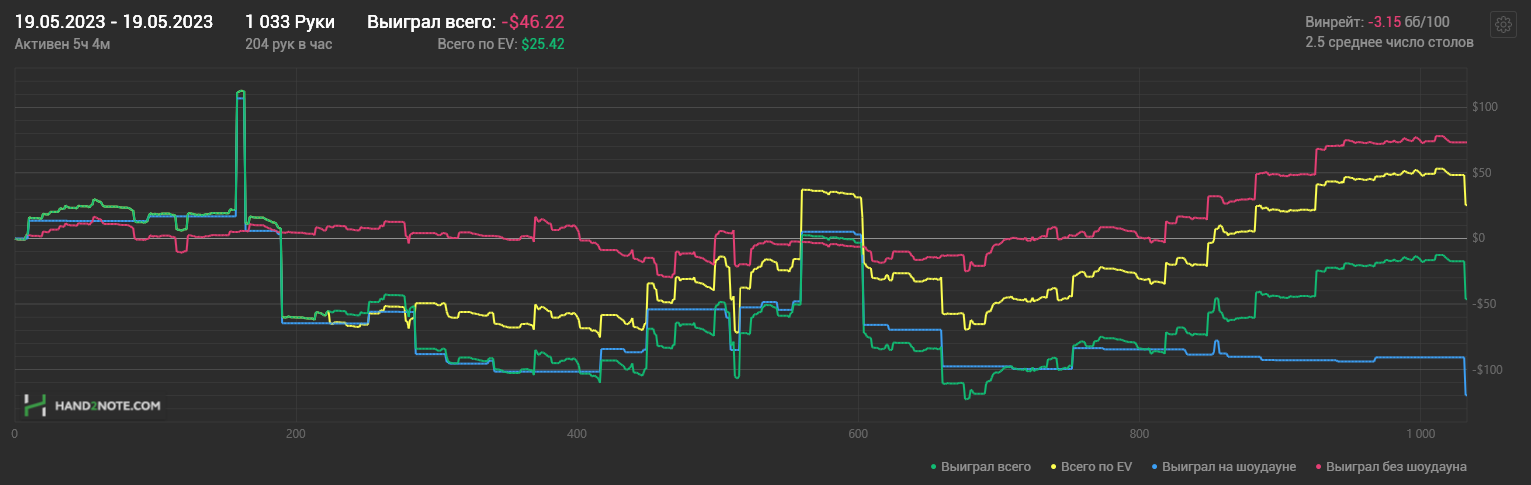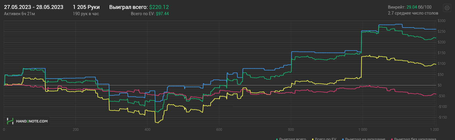 Этот день считается стартовым в мае. Раскликивался и учился садиться за столы снова. Итоговый профит будет расходиться с дальнейшими графиками, так как я играю рег столы на впн, а на некоторых из них есть бомб-поты. +30 по кассе https://youtu.be/BTQShKyPPOQ