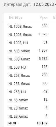 Надо бы к концу месяца определить наиболее реалистичные и выполнимые цели. Думаю начать с 120 часов за столами, 40 часов теории, а третью цель я всегда связывал с лимитами, так что пусть это будет окончательное закрепление на нл100.