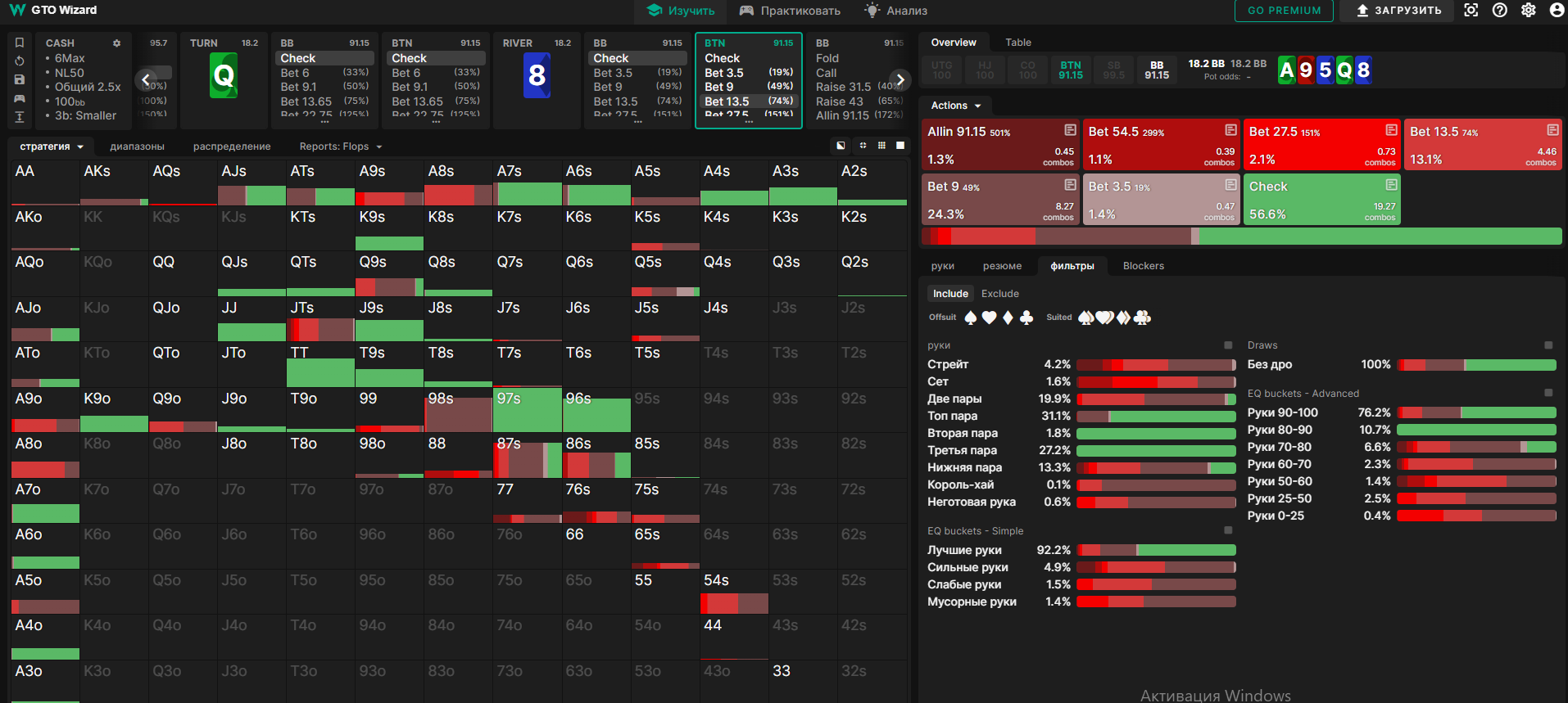 >>51056 87o) На самом деле зависит от того, кто опп. Очевидно же, что фолдить он уже не намерен. Против фиша, я бы зарывал. У них чек/рейзы, как агрессор, сильно в сторону велью смещены, так что я бы не давал дро, а только допер+. Против этого у нас в лучшем случае нулевой пуш. Против рега со сбалансированным лимпом, это наверное низ диапазона у нас. Слишком уж там много монстр-дров с кучей эквити против нас, но фолдить всё же нельзя. KJs) Второй баррель с такой рукой для тебя норма? Просто у тебя тут столько рук лучшими блокерами и с эквити, что мне кажется будет лютый оверблеф с такими руками... Это какая-то подстройка под поле? Ривер мне нравится идея, но не сказал бы что ГТО. Ты так добираешь с JJ+? Блефы тут какие-то есть вообще или ты так тупо среднее велью только ставишь? AKs) Опять подстройка? У вас тут не блефуют с 33-55 и Tx тут? Что ты вообще тут в качестве блафф-кетчера продолжаешь? Руки которые могут принимать ривер, типа KJ,QJ?