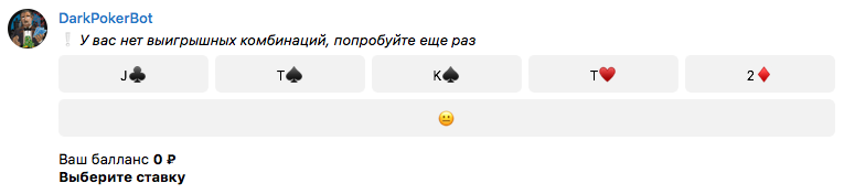 Луданы, запилил игровой автомат(видеопокер) в телеге, зацените, зайдет/не зайдет. Можно и на фантики поиграть, Можно на реальные (ставки пока копейки 10-50 рублей. Все через qiwi. Оцените хотя бы интерфейс, как вам такое?
