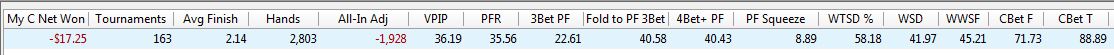 >>23249 Лол, лучше бы вместо спинов обычные снгшки или хедзапы катал. Что из книг читал? Выведи статы по количеству бб в стеке, а также по позиции. Хотя низкое WSD говорит о том, что ты либо лузовато пуши коллишь, либо сам любитель пушнуть говнецо в лузово коллящих.