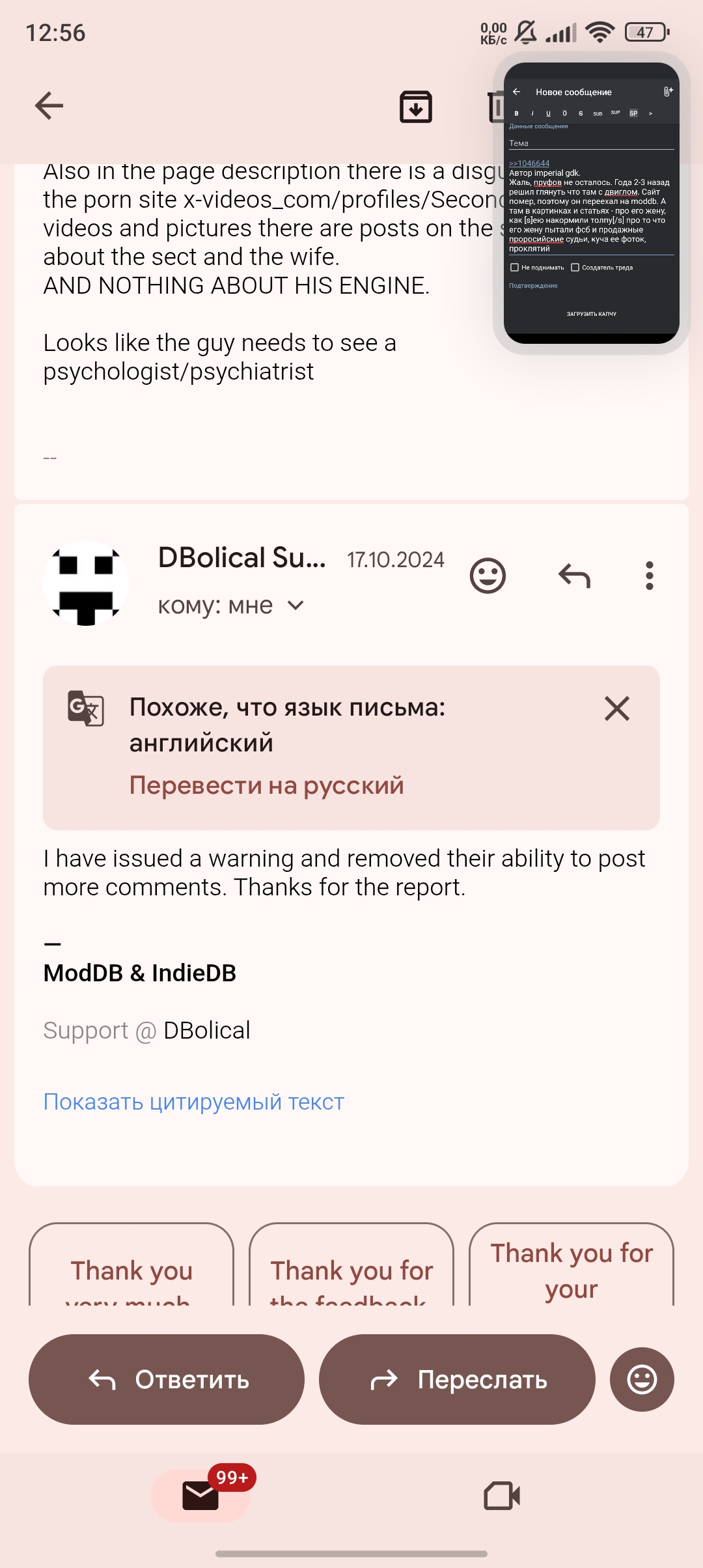 >>1046644 (OP) Автор imperial gdk. Жаль, скринов не осталось. Года 2-3 назад решил глянуть что там с двиглом. Сайт помер, поэтому он переехал на moddb. А там в картинках и статьях - про его жену, как ею накормили толпу про то что его жену загипнотизировали фсб и продажные проросийские хохлосудьи, куча ее фоток, проклятий, жалоб на то что и его пытали. А его жена типа из-за этого ушла и изменила ему то ли с ментом то ли с судьей. Така хуйня, малята. Пикрил - моя жалоба админа моддб на поехавшего.