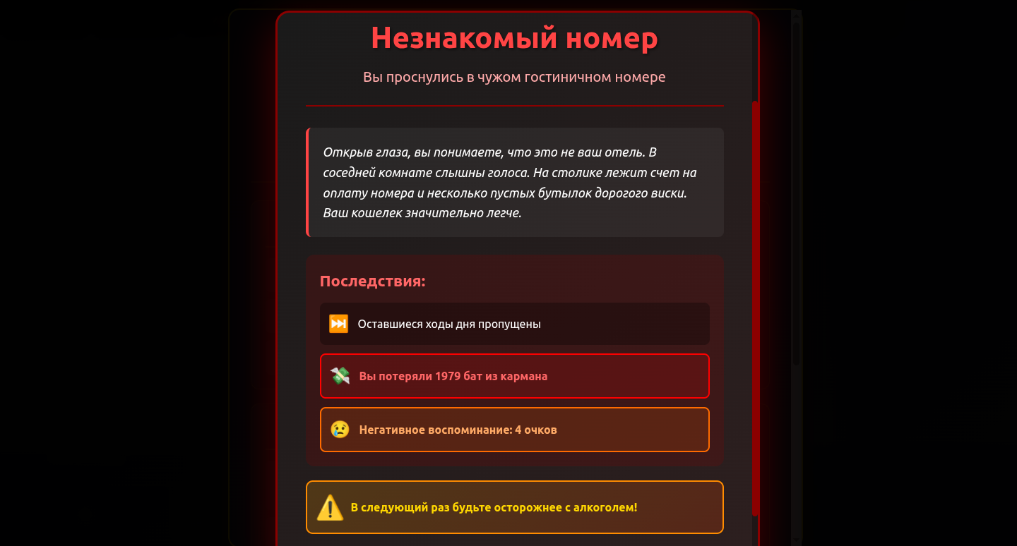 Геймплей: - У игрока есть несколько ходов за вечер. - Игрок ходит по карте и заходит в заведения разного типа, либо просто получает приключения на обычных точках. - При этом каждое событие - мини-история добавляет ему очки положительных и отрицательных воспоминаний. - Так же игрок может получать "советы", либо при общении с NPC либо на своём опыте (события). - На результаты событий влияет уровень опьянения, рандом и советы которые он получил ранее. - У игрока есть карман, в который он может покупать предметы, например пиво и трава - для увеличения уровня опьянения, кофе - для уменьшения, презервативы для того чтобы не получить заболевания и так далее.