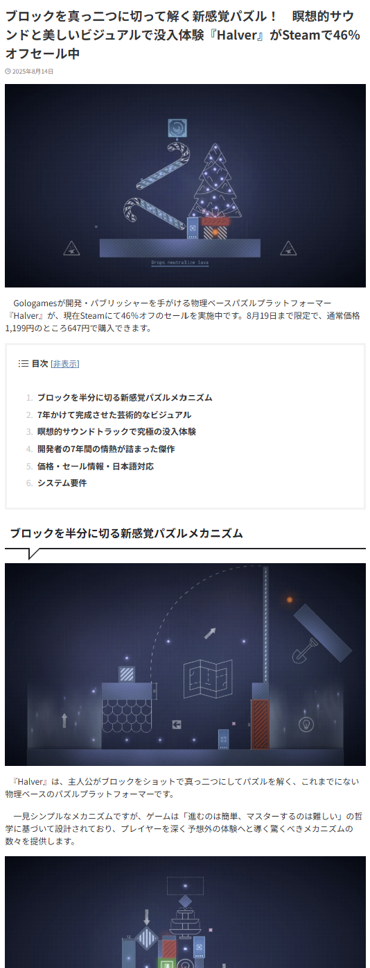 Halver — это захватывающая, основанная на физике, головоломка-платформер с большим количеством логики и прыжков на точность. Главный герой может разделять выстрелами блоки пополам, чтобы решить загадки и добраться до выхода с уровня
