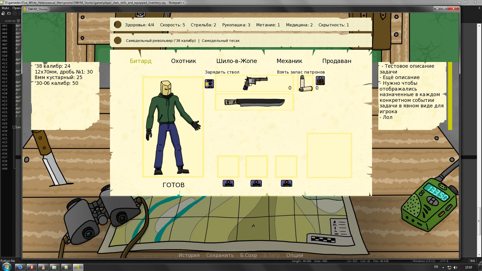 В наличии есть боевая система (по сюжету - будет улучшение снаряги, с соответствующим отображением на персонажах в бою), анимированные спрайты персонажей и врагов для боя, развитие своего выживаторско-партизанского быта, постепенная прокачка персонажей, а также упоротый и ебанутый сюжет!