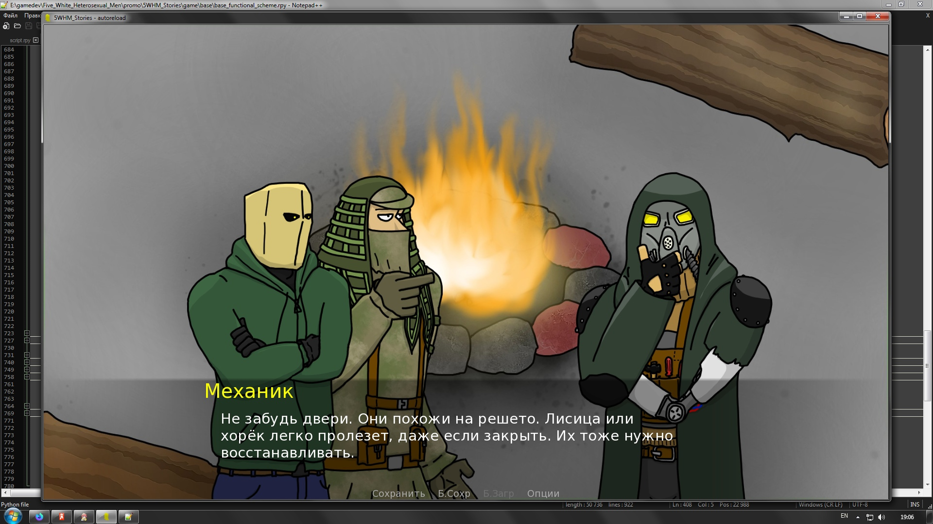 С того момента перепиливал и улучшал код, ввёл основу для зажигательного оружия + пару начальных вариантов, ввёл основу для дымов + также начальный вариант, разные мелкие допилы от отдельных анимаций в бою до того же кода. Сейчас систему порчи скоропортящихся продуктов делаю (до того сделав процесс сранья персонажами и вынос парашного ведра).