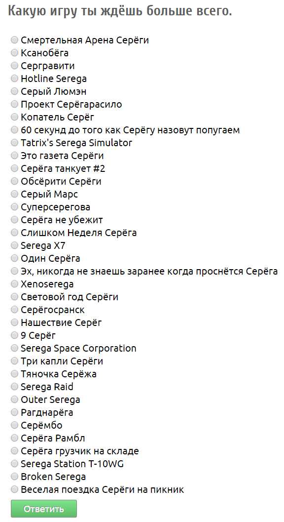 >>906191 Это какой-то прикол из конфы? В любом случае, эти названия звучат интересно: - Смертельная Арена Серёги - Серый Марс - Весёлая Поездка Серёги на пикник