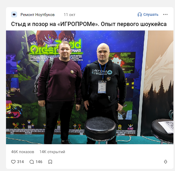 У игропрома нашел смешной пост. Они как лоукостер. Стенд бесплатно, платно это стол, стул, электричество, интернет, экран. Лол. А, еще у них почему то застройщики инвалиды и не могут за час вечером или утром переклеить самоклейку одного цвета на другой.