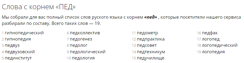 >>910302 >неприлично Сильно боишься ПЕДучилища и моПЕДОв? А на велосипедах не ездишь из-за их неприличных ПЕДалей? >список слов руского языка с корнем «пед» , которые посетители нашего сервиса разбирали по составу. Всего таких слов — 19. 1 гипнопедический 2 гипнопедия 3 педвуз 4 педвузовский 5 пединститут 6 педколлектив 7 педогенез 8 педолог 9 педологический 10 педология 11 педометр 12 педпрактика 13 педсовет 14 педтехникум 15 педучилище 16 педфак 17 логопед 18 логопедический 19 логопедия