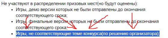 >>920362 Успокойся, уже не раз писал что этот пункт предназначен для откровенных заготовочек не относящихся к конкурсу и щитпостов. Никого из финалистов я не буду дисквалифицировать по этому пункту.