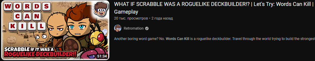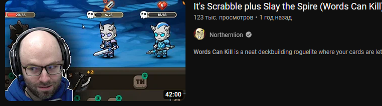 Аноны, а что вы думаете про такую игрушку: https://store.steampowered.com/app/1732090/Words_Can_Kill/ Да, графон и анимации - говно. Но какова идея! По сути это настолько же оригинально и лаконично как Baba is You. И механики ведь реализованы на должном уровне, ну кроме пары-тройки косяков. Игра просто уделывает все эти заполонившие Стим клоны Slay the Spire своим ни на что не похожим геймплеем, но даже 100 отзывов не набрала.