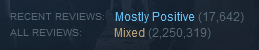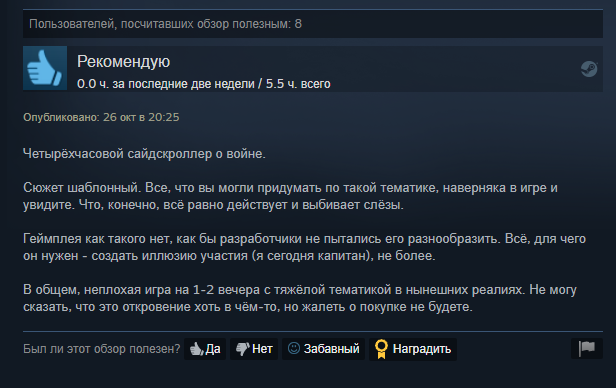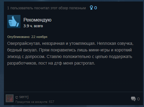 >>917401 Cмотри, долбоёб. Вот это - крайне положительные. А 200 отзывов на 1250 халявных ключей это ничто. Нет графона, нет гейплея, нет истории. Закономерно, что нет продаж. Тем более, выпускать клюквенную игру с попыткой в чернуху, это вообще максимально тупой ход.