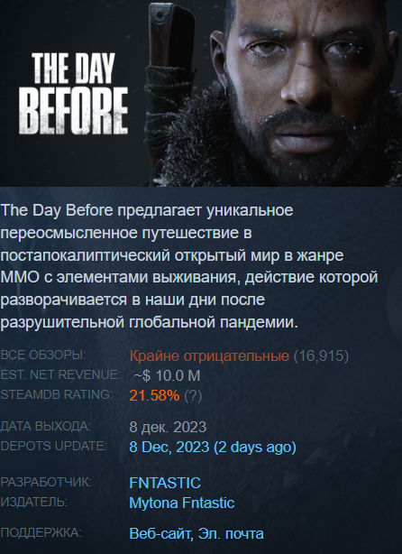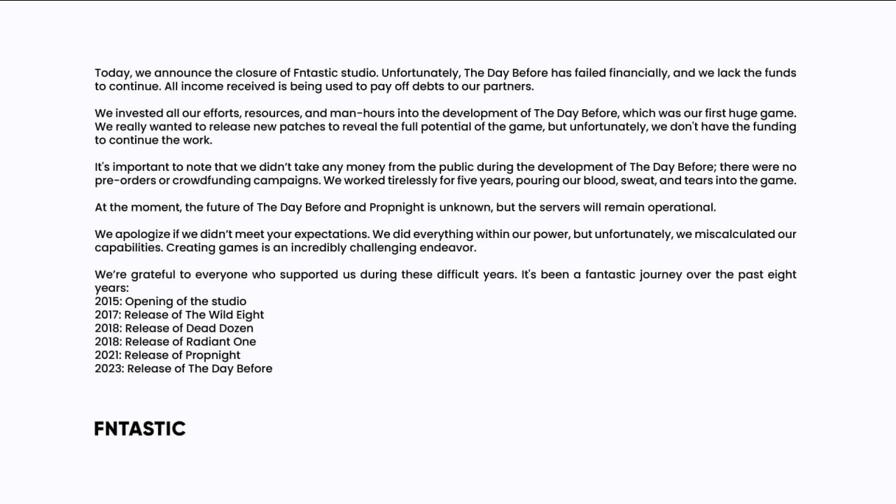 >>922112 >Зачистили сайт, оставив только заглушку с обосрамсом письмом. Зачистили Fntastic. А совместный проект с Mytona, который Mytona Fntastic - остаётся жить. Пропнайт перевели на Mytona, то есть он, очевидно, обречён. https://mytonafntastic.com/ При этом Fntastic это студия-разработчик, Mytona Fntastic это издатель The day before. То есть студия разоряется, а деньги, которые остались после рефанда уходят в карман издателя Mytona Fntastic и спонсора игры Mytona. Из левого кармана в правый.