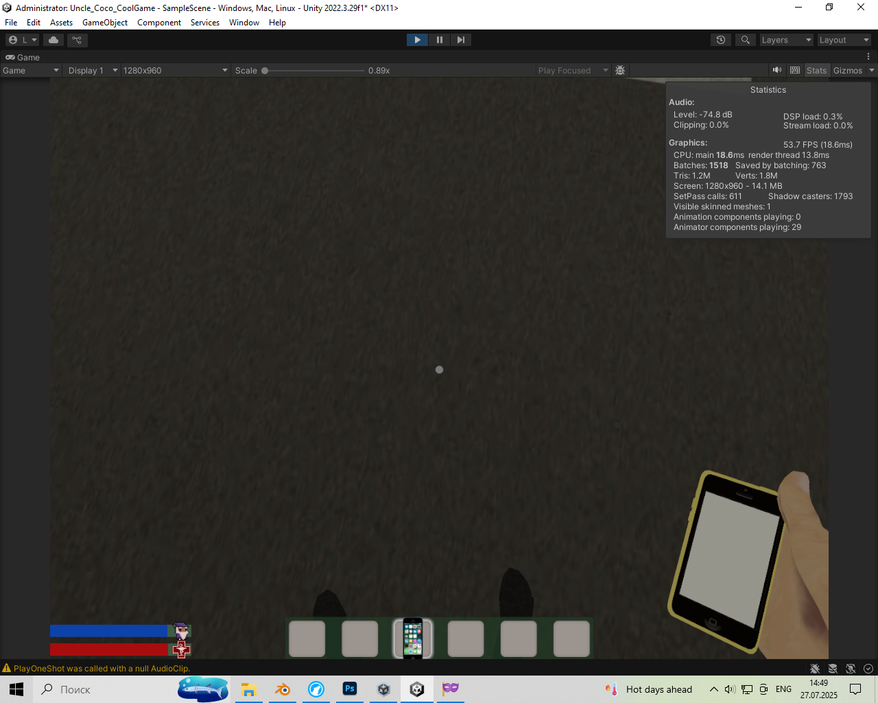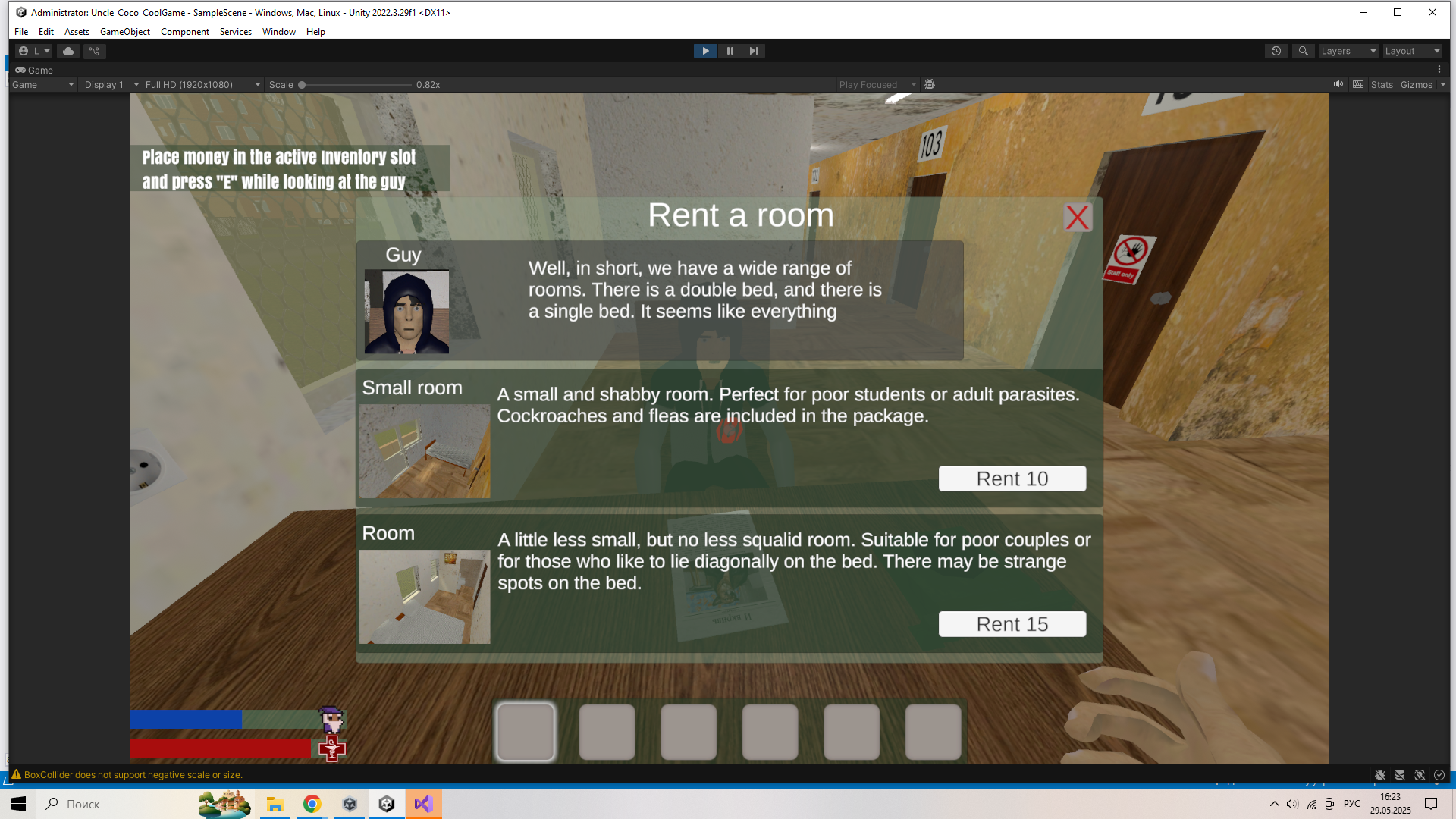 >>1025786 Последнее время увы очень занятой(+я плохо умею в тайм-менеджмент) поэтому похвастать особо нечем. Сделал чуть моделей, добавил систему торговли (можно покупать и продавать и у каждого торговца есть определённый типа вещей который он может купить). Ещё сделал возможность помириться с нпс которому мы дали по морде. А и ещё добавил всплывающие подсказки внизу экрана. Ну из значимого вроде всё. Продолжаем продолжать!