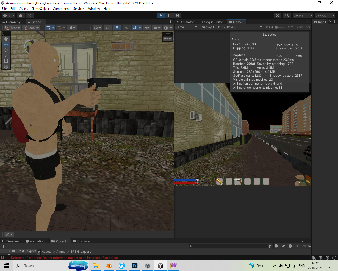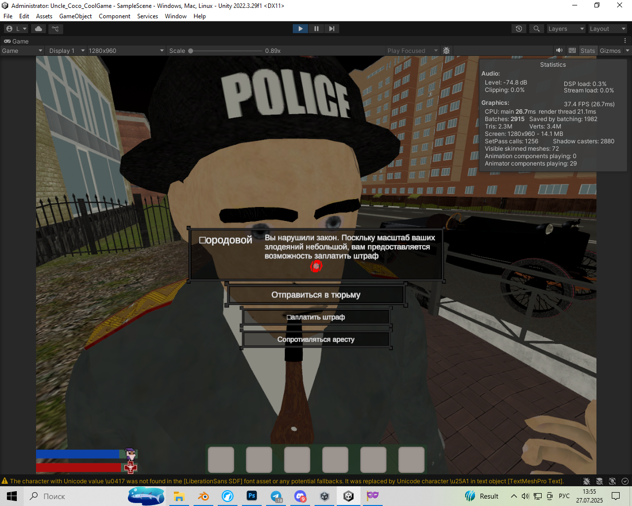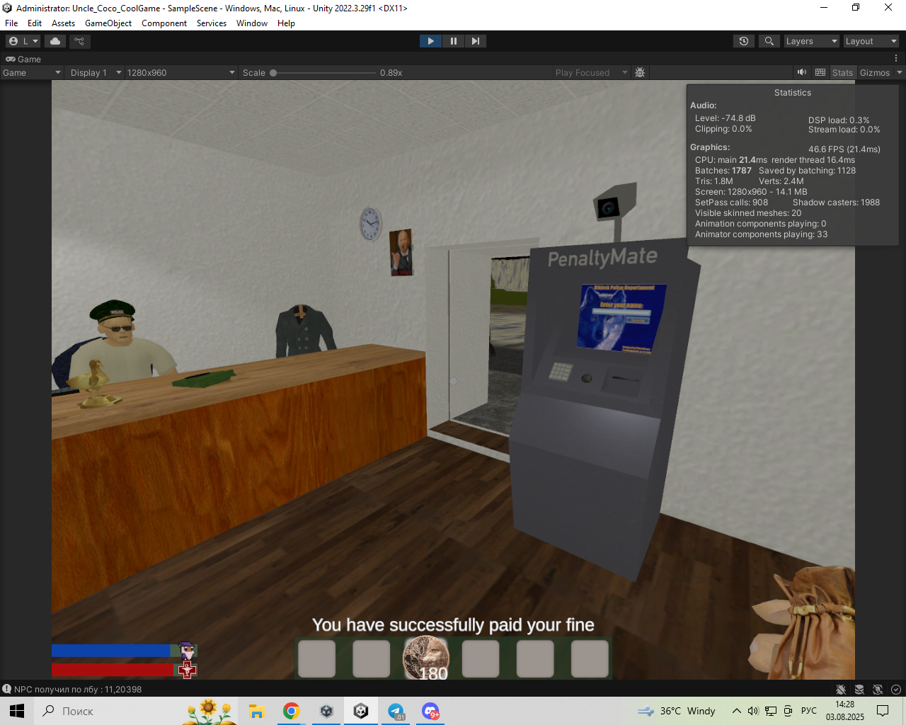 >>1040917 Добавил возможность заплатить штраф при помощи специального терминала. Такая возможность присутствует, если уровень criminalShitValue не превышает определённое значение. Также провёл багфиксы чтобы полицаи могли работать вместе и не мешать друг другу. Сейчас думаю займусь моделингом зданий, чтобы у нпс были домики или места для обитания, куда они будут уходить. К примеру бандюганы будут по ночам слоняться по улицам, а днём зависать в каком-нибудь баре "воровской закуток". А и ещё сделал чтоб у разного оружия было разное время стана, так можно будет добавить больше разнообразия