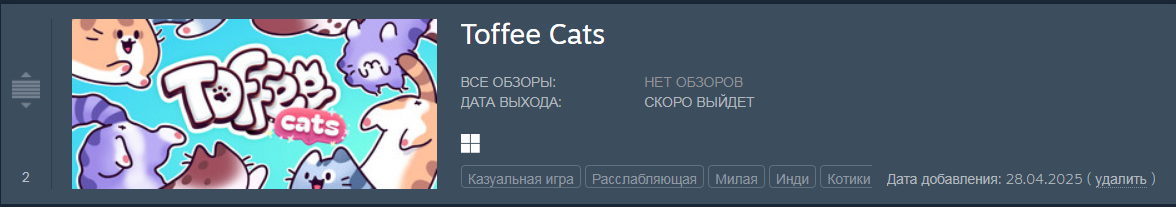 >>1019111 ОП, расскажи лучше какая у тебя динамика вишлистов сейчас? Сколько в день капает? По твоей ссылке игра все же более привлекательно выглядит, в ней значительно больше уникального арта. Каждый кот считай что отдельный арт-объект, художник жопу рвал и поэтому люди считают себя обязанными оплатить труд. У тебя же коты хоть и симпатичные, но стиль очень дженерик и много копипасты.