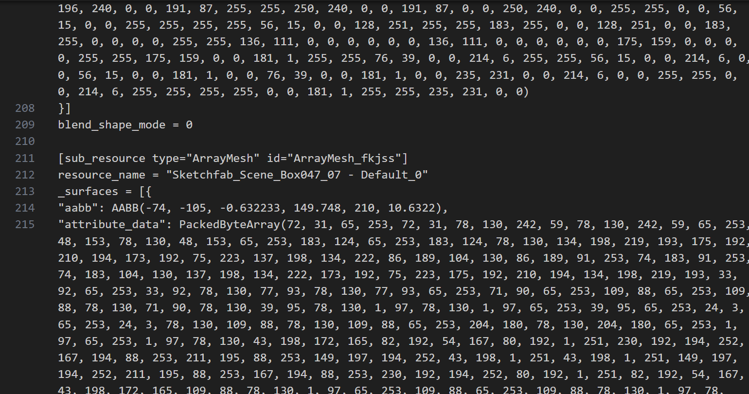 >>1022220 Ну я предпочитаю оставить текстовым, вдруг надо будет что то поправить быстро в блокноте. Иногда даже генерировал какие то данные на питоне и копипастил в PoolArray. Собственно ты можешь открыть в блокноте или другом текстовом редакторе, пойти попить чайку и увидеть что там не упаковалось. Как то давно я редактировал террейн и там была опция авторасстановки деревьев/кустов/травы, и сцена стала тормозить при сохранении в редакторе. Оказалось что их координаты хранились текстом (а я думал там просто "границы" областей хранились), но там было в разы больше данных чем надо, как будто глюкануло или аддон хранил все предыдущие расставленные до undo. Пришлось как то вычищать.