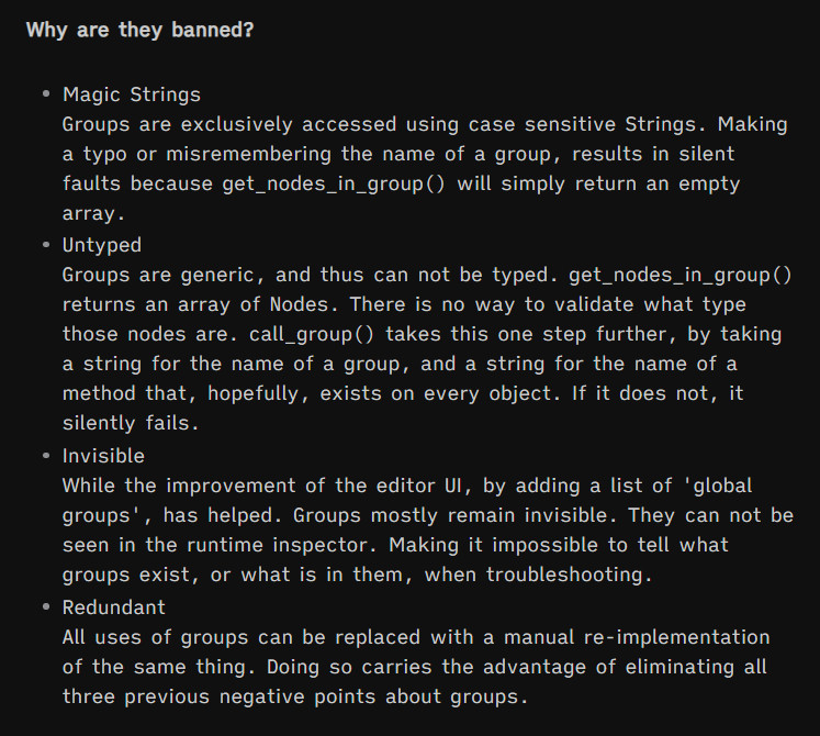 >>1023027 Целевая платформа какая? Могилки/веб/стим/все сразу? Подводные следующие: годот 3 gles2 стабилен везде, но нужно вырезать из движка gles3 функционал (да, ручками), иначе есть риск падать на некоторых МТК устройствах, потому что инит графики под мобилу писали криволапые уебки. Годот4 - пока что только пк, веб и мобилка имеют проблемы на некотором железе. У годота нет нормального функционала для обработки спрайтшитов и формирования из них анимационных блоков, есть только atlas texture где тебе будет предложено вручную раскидывать каждый кадр из спрайтшита в отдельный атлас-ресурс и как-то блять их компоновать. Короче, нужен кастомный ресурс на такое. Рейкастить в годот 3 нужно создавая рейкастноду, перемещая её, задавая параметры и вызывая её функцию рейкаста, в 4 годоте - по максимуму использовать raycastquery, вплоть до сбора всех рейкастов в пул и их выполнение в конце кадра. Почему - гднатив срет в штаны слишком жирными аллокациями. Интерфейс как в юнити, более чем хватит. Больше подводных нет, как движок годот сам по себе хорошо подходит.