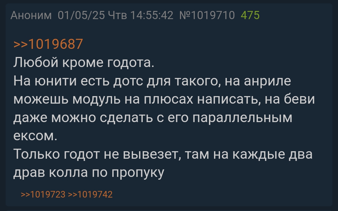 >>1026467 Я бы подумал что это нейронка отвечает, но даже нейронки не такие тупые. >Зачем извращаться с затыканием дырок GC и всё без макросов, если можно с макросами и не извращаться? Шиз, ты где макросы в гдс рассмотрел? >А в чём проблема убирать мусор за собой? Шиз х2, я тебе показал как за собой убирать в шарпе >Когда появится что-то новое, твой фреймворк скорее всего устареет точно так же, как и все игровые движки... За три года все никак не устареет, большое спасибо паджитам - и дальше будет только моложе. >ты не опоздал? Хайп, вроде, прошёл уже. Шиз х3, я написал что это хобби блять, не для денег. Я делаю игры не для денег (пока). >Предел годота в вебе примерно равен пределу... Шиз х4, ты нахуя это высрал? Примерности ебаные себе оставь, и пиши по делу. Я в браузере запускал годот бенчи, они там охуенно работали на машинах уровня печатная машинка. Есть вебфишинг в стиме, 3д веб игра на годоте, еще и онлайн.