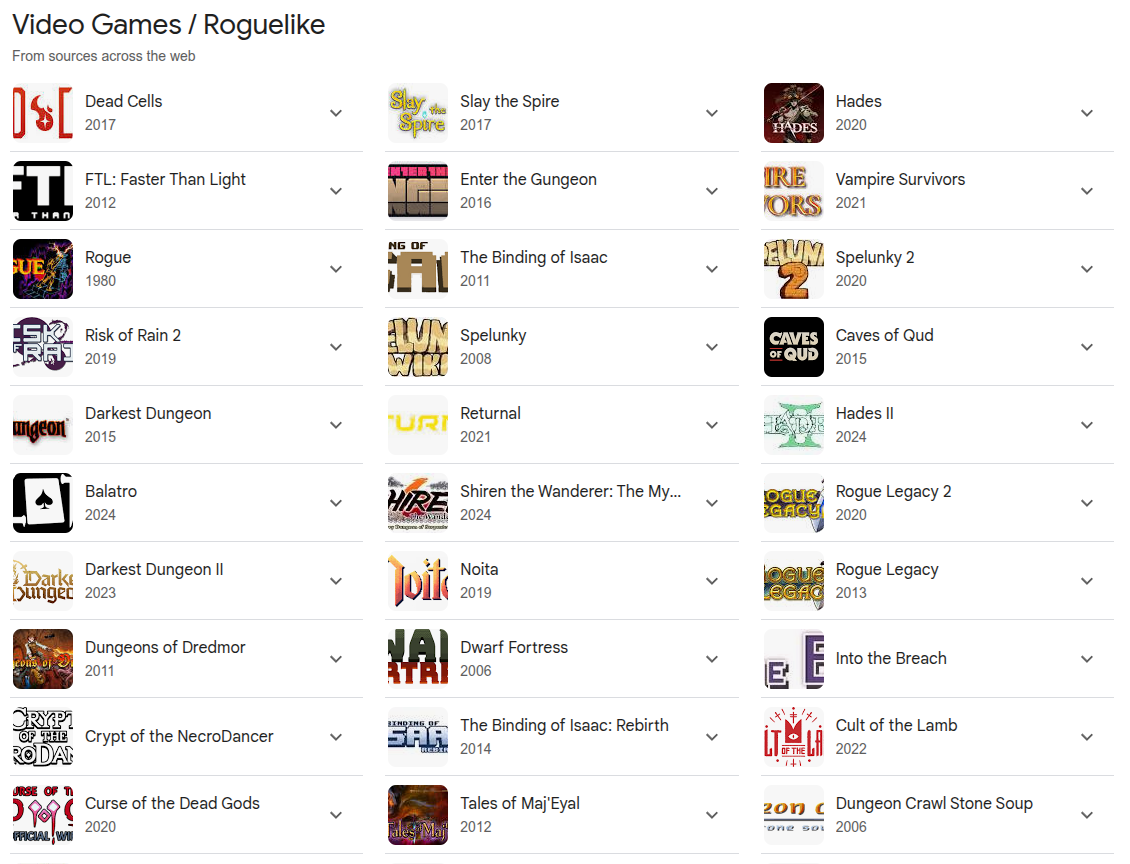 >>1026524 >from sources across the web В основном это порриджи раздают тэги "рогалик" в стиме, потому что слово модное, как десять лет назад "инди". По факту уже в первой игре в твоём списке от рогалика ничего нет: нет пермасмерти, нет пошаговости, нет вида сверху, нет привязки к сетке - обычный платформер с прогрессом. Почему он рогалик?