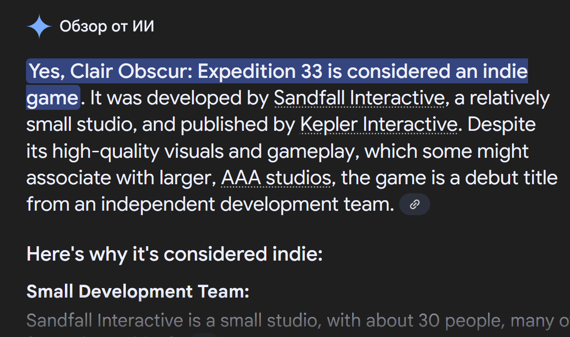 >>1026524 Ты буквально обосрался, приведя в качестве пруфа нейросетевой высер гугла. Напомню что он приписывает Clair Obscur к инди, при этом этот ответ находится прямо между выдачами где написано что это не инди.