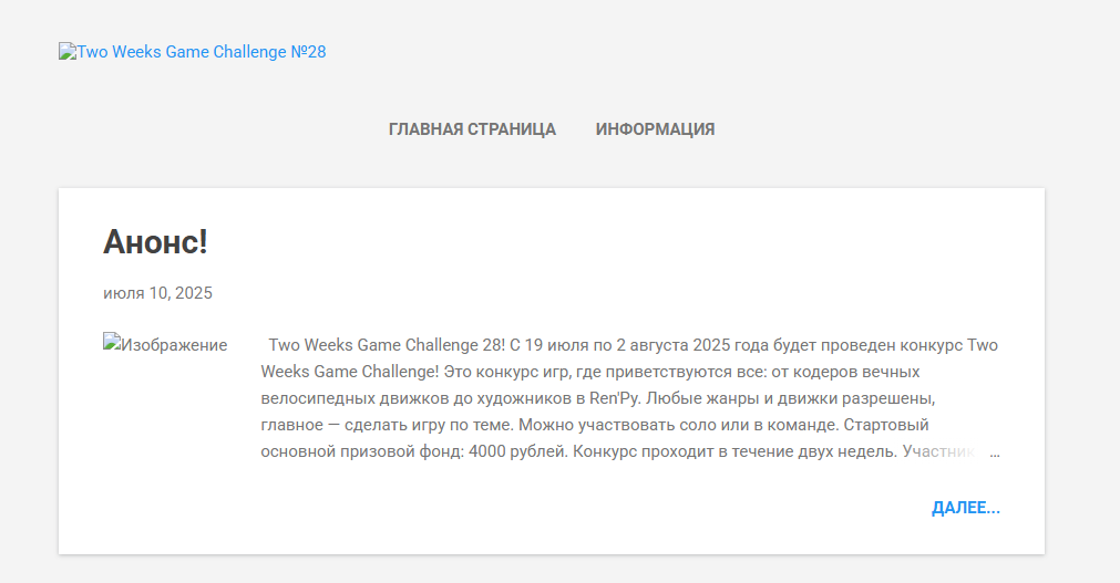 С 12 по 26 июля 2025 года будет проведен конкурс Two Weeks Game Challenge! Это конкурс игр, где приветствуются все: от кодеров вечных велосипедных движков до художников в Ren'Py. Любые жанры и движки разрешены, главное — сделать игру по теме. Можно участвовать соло или в команде.