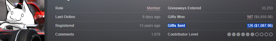 >>1032401 как я раздавал гифты купленные за копейки, но которые показываются в статистике за фуллпрайс, но при этом выпросил и выиграл сотни игр на несколько штук баксов, но при этом в своем манямире я не попрошайка