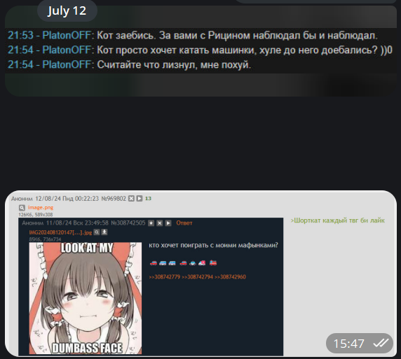 >>1032350 Короткий кот, тебе вообще ок топить за синдикат, настолько что ты призывал димасика "завайпать цепнями маркова" на прошлом конкурсе, при этом ты 24/7 в его конфах сидишь и в целом с тусовкой коджема общаешься (помню стрим совместный)? Тошнит от таких лицемерных гнид
