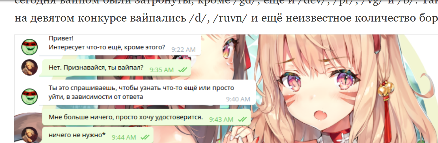 >>1032369 А ты то что за них переживаешь, ты девушка Коджема с Димасиком что ли? Окей, поясняю для аутичных няш: про вайп это шитпостинг и рофл, и вообще фраза "завайпать димасика" не имеет опредленного смысла. Завайпать можно форум, а не личность. Палка сам спросил что делать с несправедилвостью в конкурсе, и кот ему всего лишь напомнил о его же старом методе. И да, посмотреть на вайп сосаки было бы весело, что не так? Тем более цепями, реально ржачно было их читать.