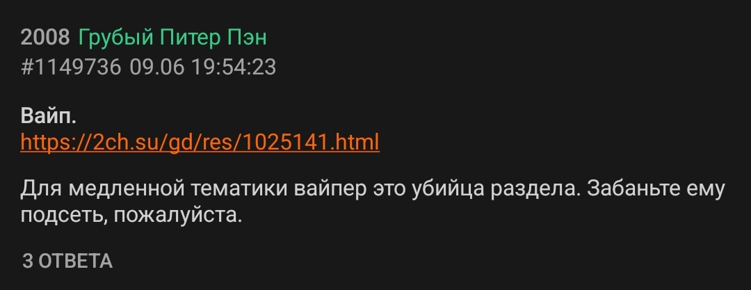 Добавлю к >>1032137 - вся суть действий этого персонажа в том, чтобы его обсуждали. Не будет реакции на одну вебем - он запостит 10, лишь бы кто-то увидел и ответил что-то, пусть даже негатив. И так уже почти 10 лет. Я к сожалению и сам его обсуждаю сейчас и отчасти ему потакаю, но это только чтобы дать контекст. Его банят, он передергивает роутер, и срет дальше. Чистят посты - он высирает х2 от вычищенного. Ебаная раковая опухоль доски.
