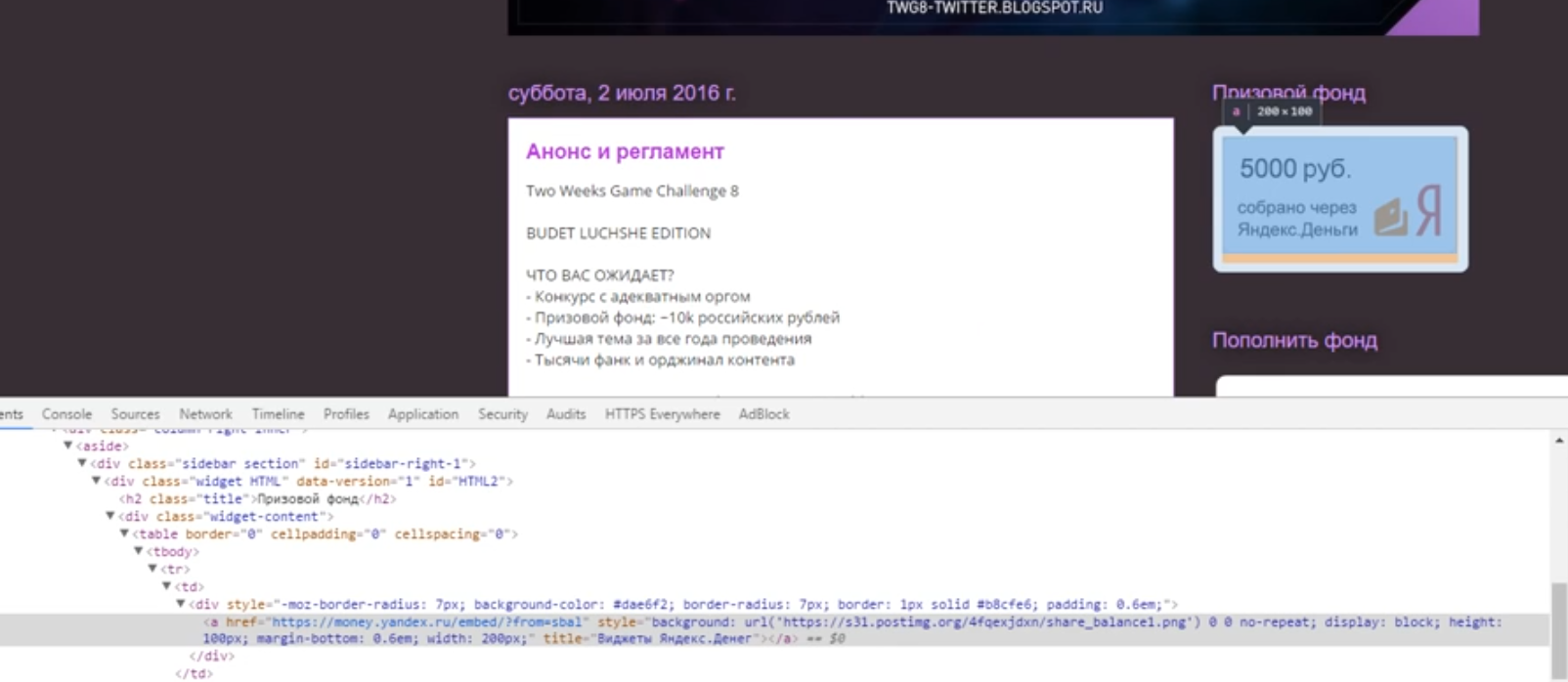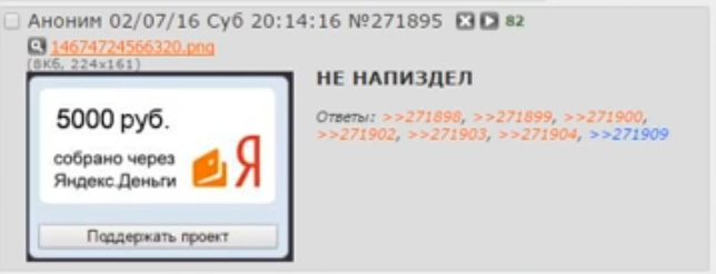 Был такой анон-имяблядь, Твиттерский-кун. Он хотел организовать третий параллельный восьмой. В его блоге гордо висело, что у него есть аж фонд аж в целых 5к (обещал 10), тогда ещё можно было это динамически показывать с яндекс денег. Вот только дело в том, что никаких 5к там не было, а картинка была не с яндекс денег динамическая, а просто пик залитый на картинкохостинг. При этом он ещё в тредю писал что НЕ НАПИЗДЕЛ со скриншотом "фонда". Это вскрылось, твиттерский начал оправдываться, но было уже поздно, звали кидалой/кидальским с тех пор