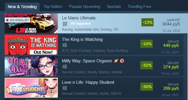Крч, порно игры это узкая ниша, и их максимум это в нью энд трендинг пробиться, куда в топы редко бывает. Я бы их вообще как игры не классифицировал, а в отдельную категорию, как казик.