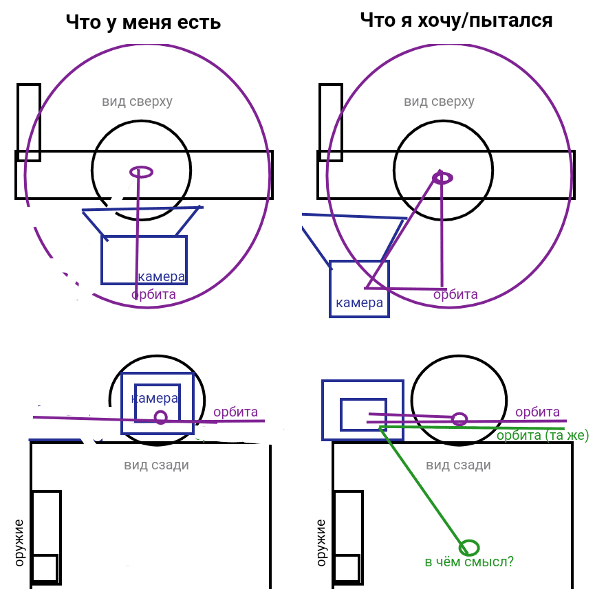 >>1042342 По идее, должно быть наоборот. Это игрок управляет камерой, а персонаж на это как-то реагирует. Суть проблемы во вращении камеры по орбите вокруг персонажа, чтоб это было удобно для прицеливания.