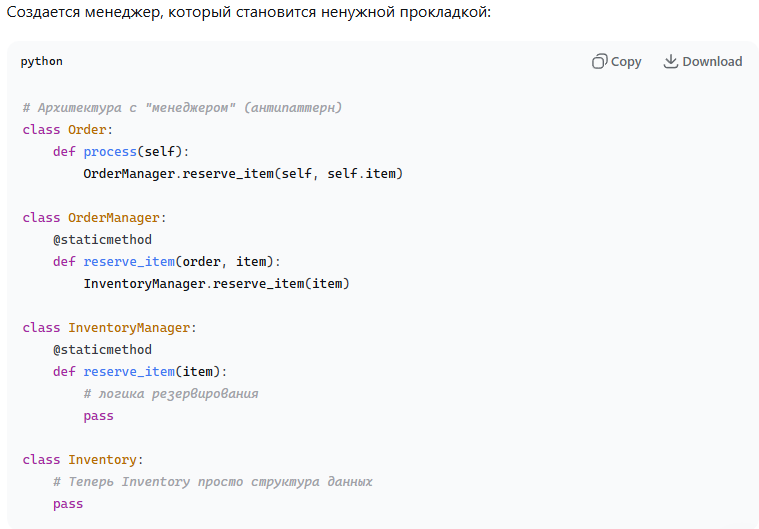 Почему это проблема ("проебались")? 1. Нарушение инкапсуляции: Менеджер часто знает слишком много о внутреннем устройстве других классов и начинает управлять их состоянием, нарушая их собственные обязанности.