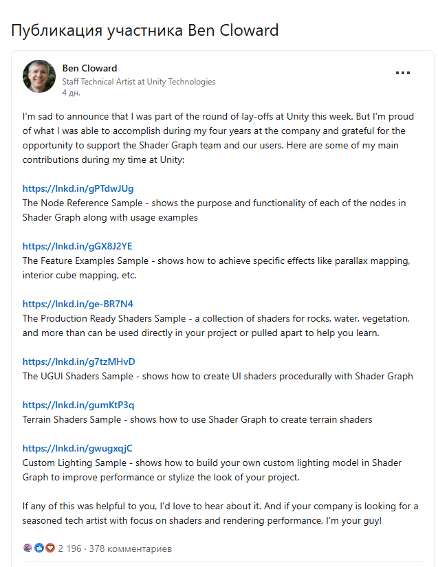 Опытный разработчик Бен Кловард пострадал от увольнений в Unity (https://80.lv/articles/veteran-developer-ben-cloward-impacted-by-unity-layoffs) Бен Кловард работает в индустрии уже более 20 лет и широко известен своим опытом в разработке шейдеров. Бен был одним из создателей ShaderFX, встроенного инструмента для создания шейдеров в реальном времени в 3ds Max и Maya, а также первым автором Uber Shader для Maya. В последние годы он входил в команду Unity Shader Graph и делился своими знаниями, выступая на крупных отраслевых мероприятиях и ведя канал на YouTube с более чем 75 000 подписчиков. Что касается его фразы «цикл сокращений», то пока нет никакой информации об этом, так что это либо небольшое сокращение, либо о нём ещё не было официально объявлено.