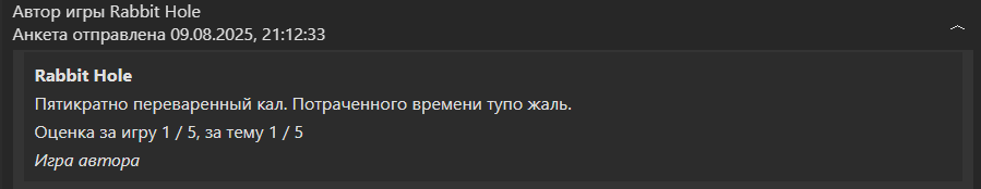 Оценки вообще выставлялись хуй пойми по какому принципу, там скорее просто нравится/не нравится другого объяснения я не могу найти, как можно посчитать игру про Мару с отвратительнейшим геймдизайном(И ЕЩЁ ПРИЗ ВЫДАТЬ ЗА ЛУЧШИЙ ГЕЙМДИЗАЙН рукалицо), но вылизанную лучше игры про Сонный Шифт, не помню точно, там пчел пьёт таблетку и впадает в бесконечный кошмар. Как можно было игре, где глав герой попал на планету с бесконечным гриндом, отдавать призовое место? Вы играли в неё? Технически - очень много работы проделано, но в итоге довольно нудно и скучно и рандом поломан, но больше всего обидно за того придурка с манерным голосом который до сих пор сидит на xp и его игру про чувака который не могу уснуть. Пчел за три дня сделал таймкун, а вы ему дали лучший высер, серьёзно? Лягушка которая срёт на унитазе норм, а это высер? Вы что только по видео стримам игры оценивали? А игра этого.. лодочника с гомодевочками, которую он нейросетью создал, она же на голову выше всего что было, но вам же ума не хватило даже запустить игру. (признаться я сам сначала не понял, автору видимо не хватило тестов, чтобы понять, что стартовую подсказку нужно было делать с более низкой скоростью). Но игра не только интересная, но реиграбельна, сам несколько раз прошёл.