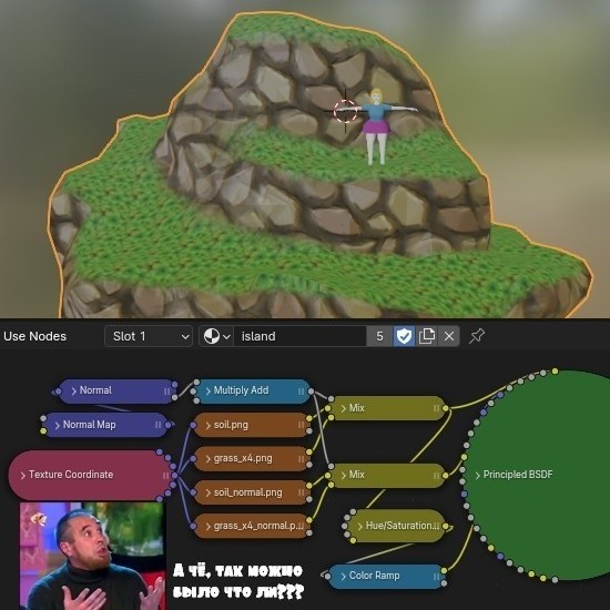 Остров: с геометрией пока не определился, но хочу композицию из частей с вращением, так что юзаю трипланарный маппинг вместо UV. Текстуры долго использовали NoiseTexture, но я хочу сделать что-то мультяшное - накидал пару текстур на пробу. Траву дорабатывать нужно, но вот почва выглядит прям практически как нужно, только слишком бледная... Собственно, в реальности почва тоже как говно - "фотореалистично" получается, ты так не думаешь? Серьёзно, это куски грунта, как им ещё выглядеть?