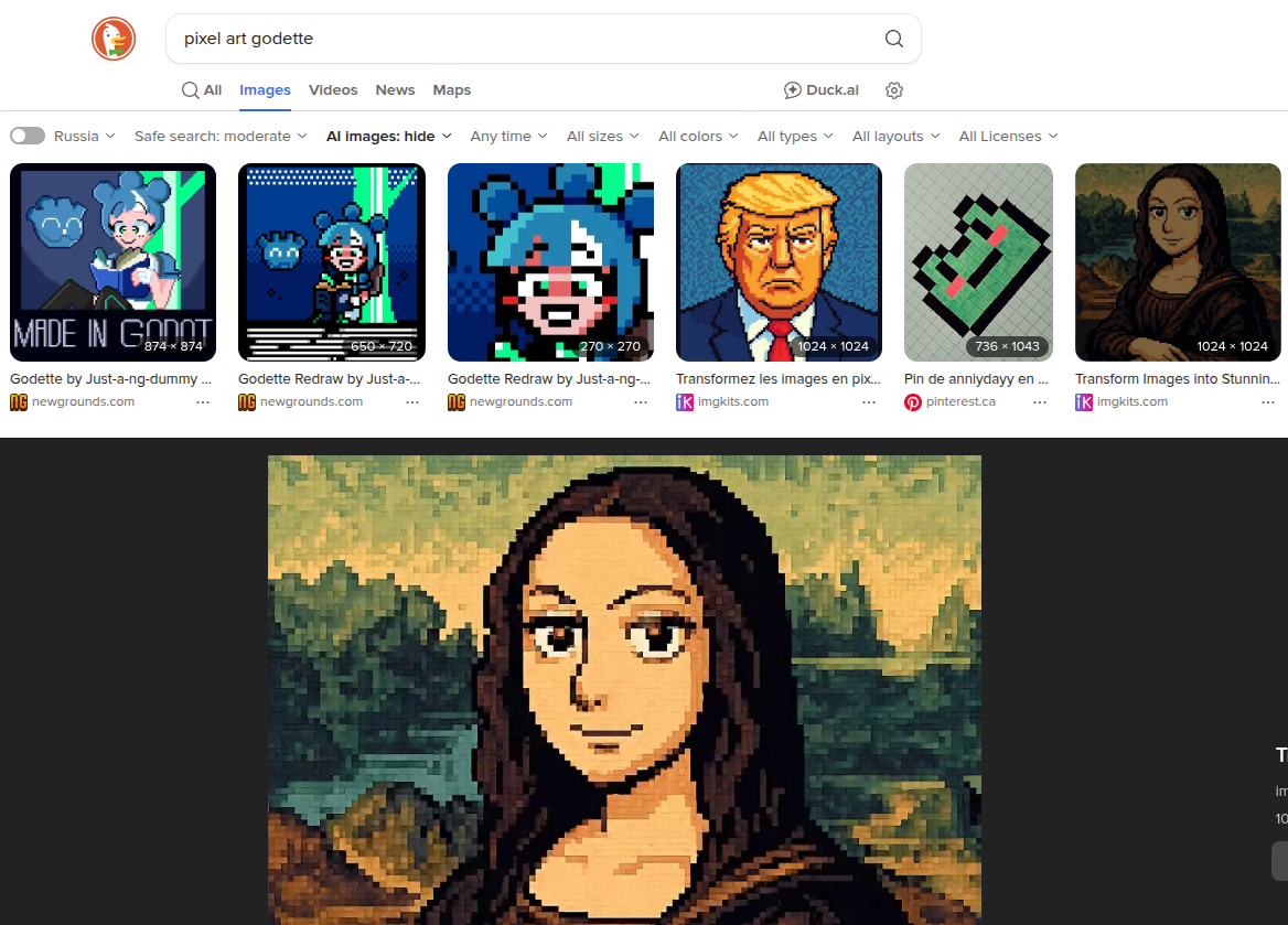>>1055674 >pixel art godette >литералли 3.5 картинки на весь интернет >ожидает увидеть тонны годных результатов по этому запросу Ты совсем запутался - веб-поисковик в роли generative AI используешь? Используй Яндекс.Картинки - там норм. Но у меня он тормозит как-то...