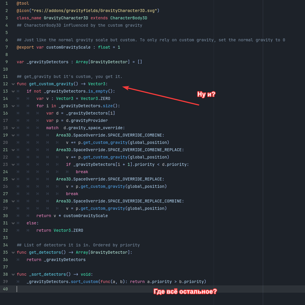 Соответственно, да, я выгорел прямо на стадии предпродакшена, не смог в инверсную гравитацию. Мне аноны даже пытались помочь, проекты скидывали с примерами. И я сам кучу материалов перекопал в интернетах, на тему гравитации и планетарной ходьбы. Пока я не смогу, пока не научусь, мне нет смысла двигаться дальше. Потому что весь остальной геймплей и фишки завязаны на инверсно-планетарную гравитацию.