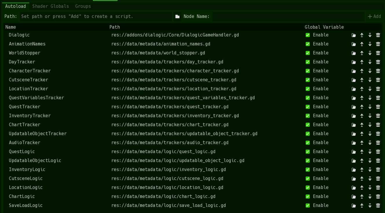 Как много автолоадов считается слишком много? Я тут набрал пару десятков, но в целом это всё нужные вещи. Трекеры отвечают за хранение и взаимодействие с ресурсами, Logic'и отвечают за изменения состояний вещей в игре. Например в CutsceneLogic я прописываю функции, вызываемые после отображения какой-то катсцены. Логики вызывают только либо другой логик, либо свой трекер. Так я могу из диалога запустить катсцену, из катсцены добавить предмет в инвентарь, из завершения квеста вызвать катсцену и так далее. Очень гибкая структура, очень полезна для того, что я пишу.