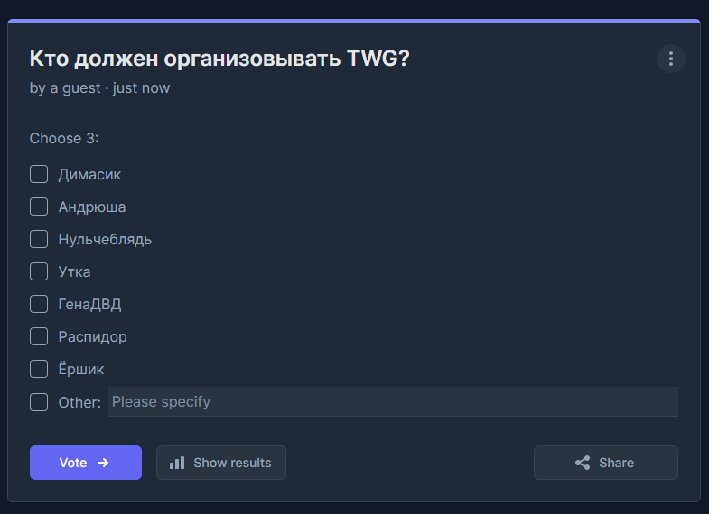 >>1064770 не ты же решаешь какой твг легитимен, а какой нет. это решают модераторы раздела, прошлые организаторы и другие олды кто участвовал, а не анонимы с кубодемкой за плечами