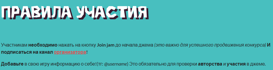 >>1067313 >Участникам необходимо подписаться на канал организатора(t.me/ebanyipidor) >Добавьте в свою игру информацию о себе!(тг: @username) Это обязательно для проверки авторства и участия в джеме. Большое спасибо, идите нахуй.